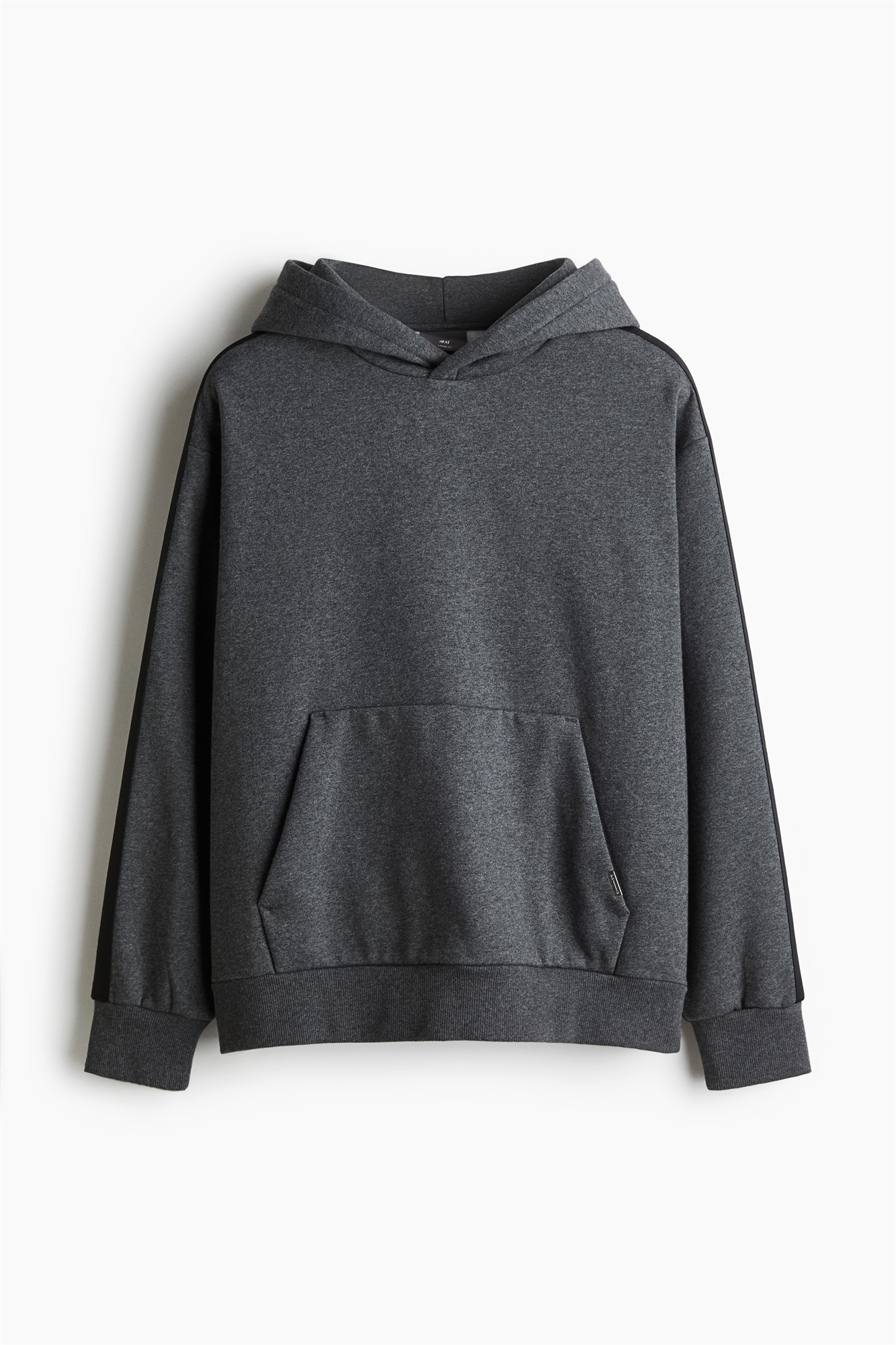 Толстовка из плотного толстовочного материала из смеси хлопка с мягким начесом внутри. Капюшон на подкладке, спущенные плечи и длинные рукава с боковыми полосками из гросгрейн. Карман-кенгуру и окантовка манжет и подола. Свободный крой для пышного, но не чрезмерно большого силуэта.