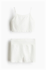 Спортивный комплект из ребристого функционального трикотажа с добавлением DryMove™, который отводит влагу от кожи, обеспечивая комфортную сухость во время движения. Короткий топ с узкими плечевыми лямками. Шорты с широким поясом. Комплект сконструирован с минимальным количеством швов для более комфортной посадки и повышенной подвижности.