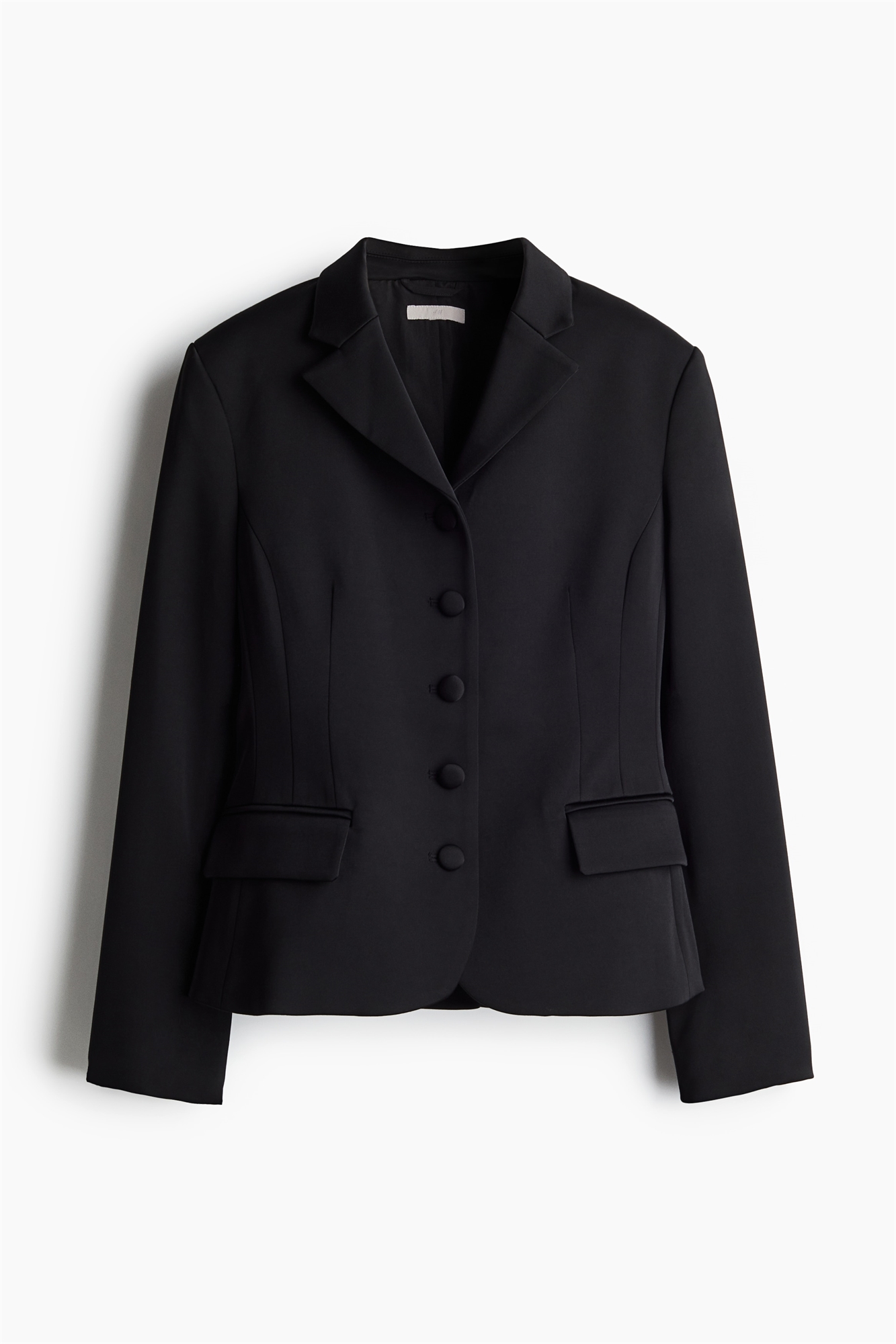 Приталенный однобортный блейзер из атласа с лацканами с вырезом, закрытыми пуговицами спереди и втачными передними карманами с клапаном. Накладки на плечах и длинные рукава с разрезом на манжетах. Формообразующие швы спереди и сзади для создания облегающего силуэта. На подкладке.