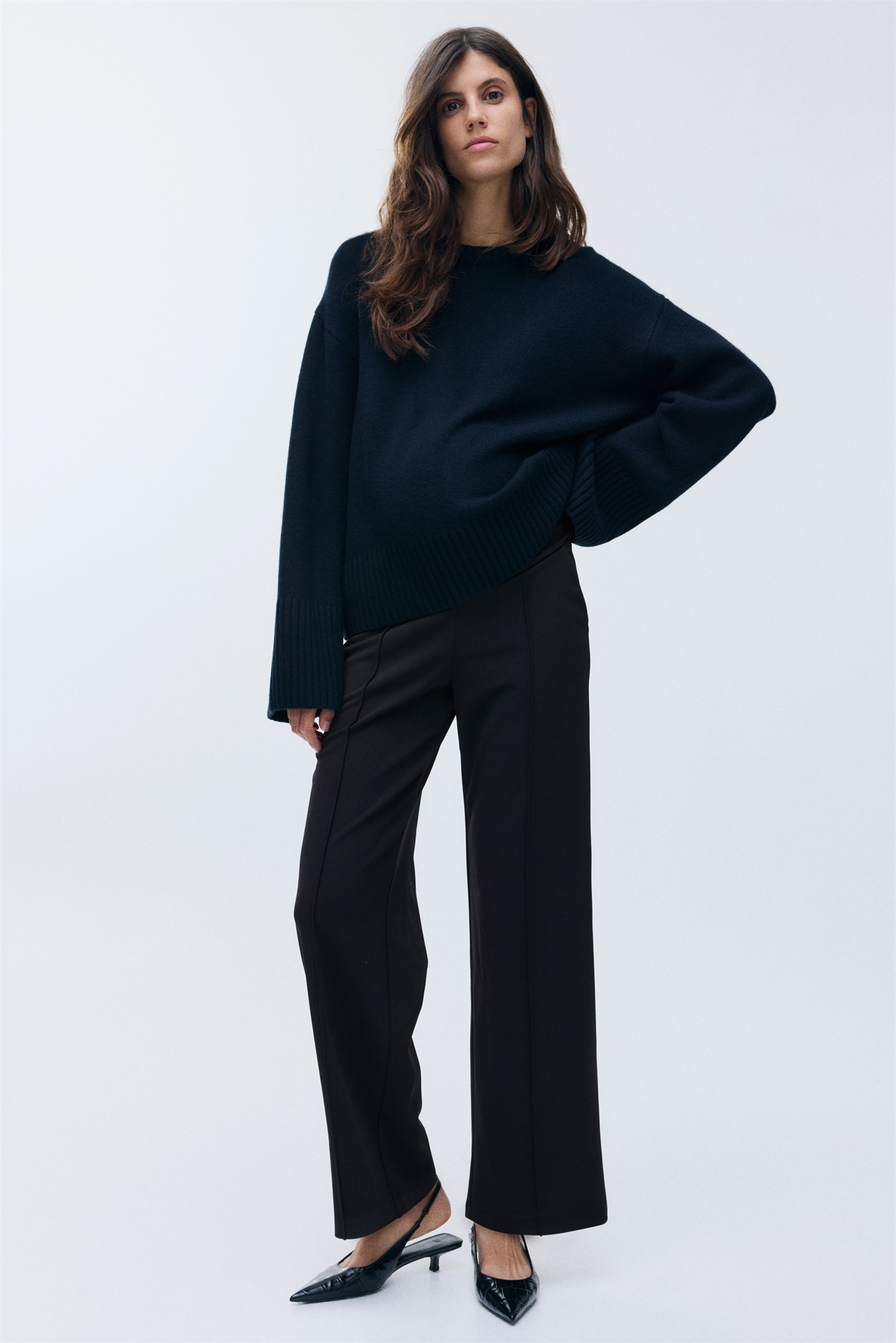 Приталенные брюки из крепового джерси с широким поясом для лучшей посадки на животе. Прямые ноги с застроченными складками спереди.