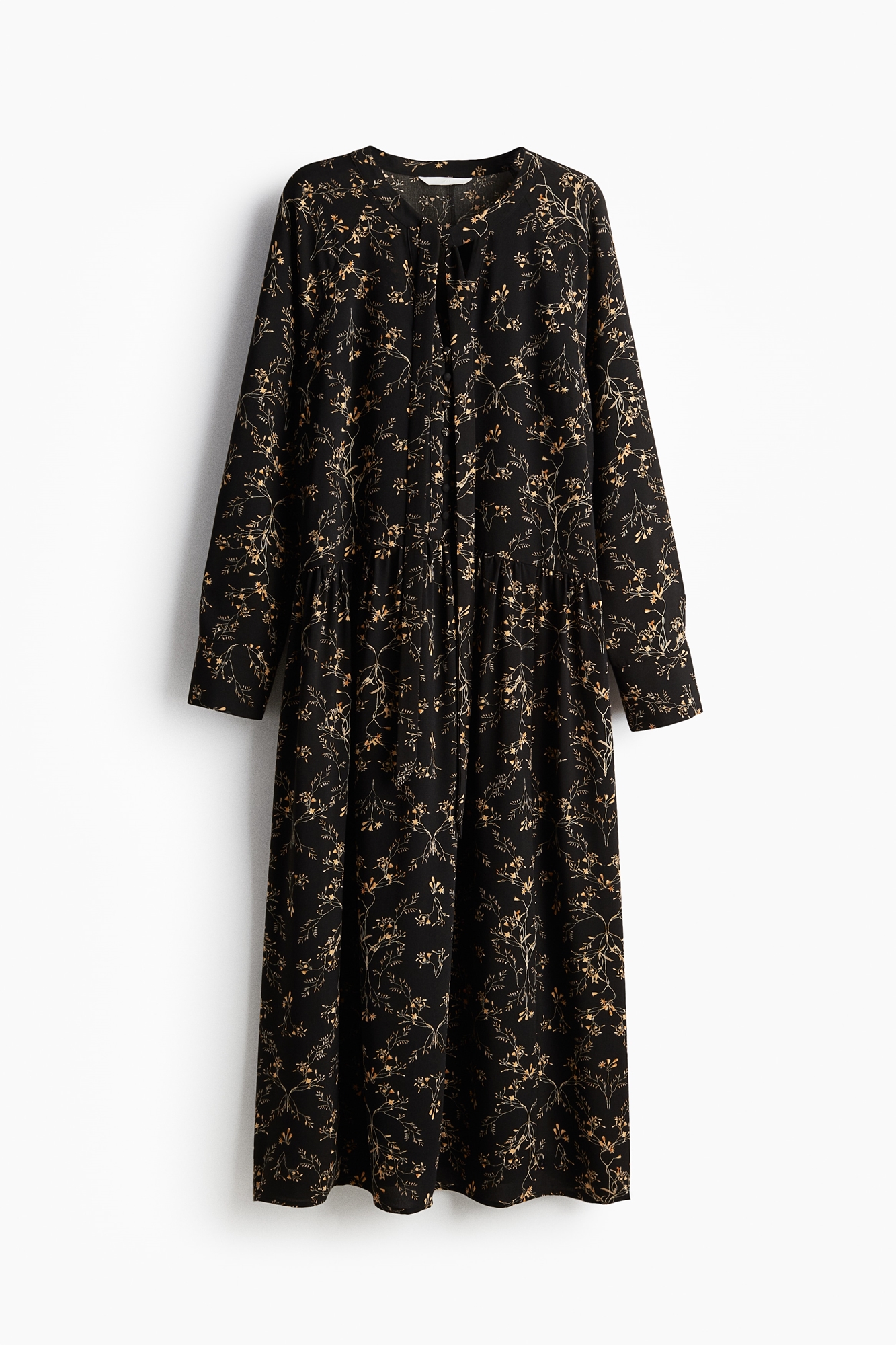 Платье длиной до колена из тканого материала с круглым вырезом, V-образной проймой с длинными завязками и закрытыми пуговицами спереди. Длинные рукава реглан с пуговицей на манжетах, сборка по шву ниже бедер и расклешенная юбка. Без подкладки.