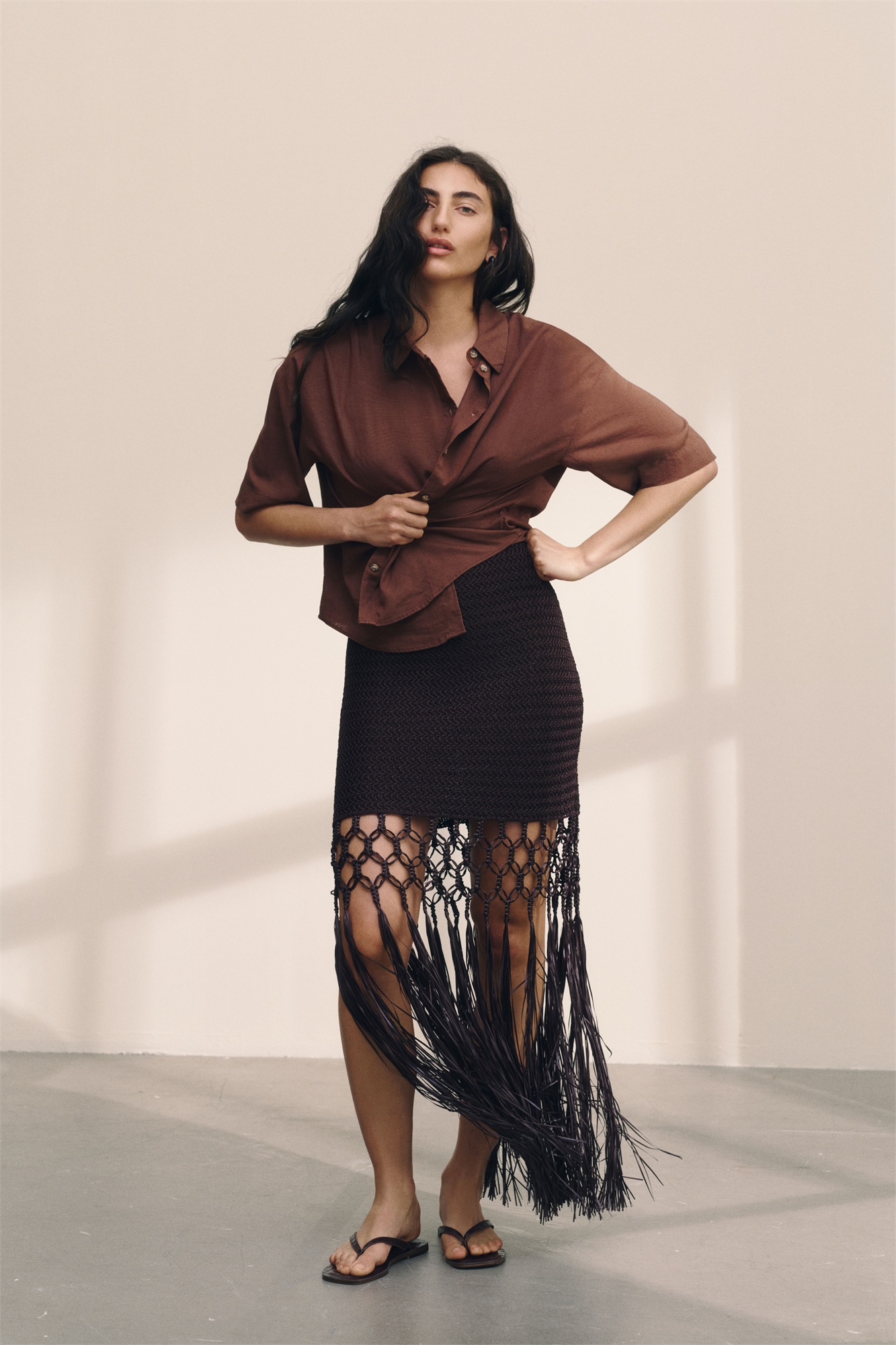 Рубашка из воздушного льняного и вискозного полотна с воротником и пуговицами спереди. Свободный крой с перевернутой складкой сзади, спущенными плечами и рукавами длиной до локтя. Аккуратный подол.