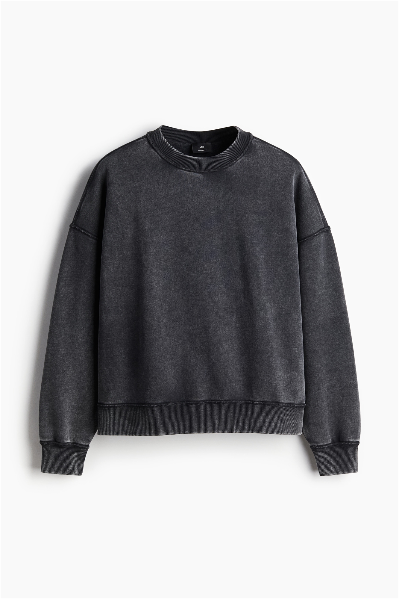 Топ из плотной хлопковой ткани в виде толстовки с круглым вырезом в рубчик, спущенными плечами, длинными рукавами и окантовкой на манжетах и подоле. Покрой "оверсайз" обеспечивает мешковатый и свободный силуэт.