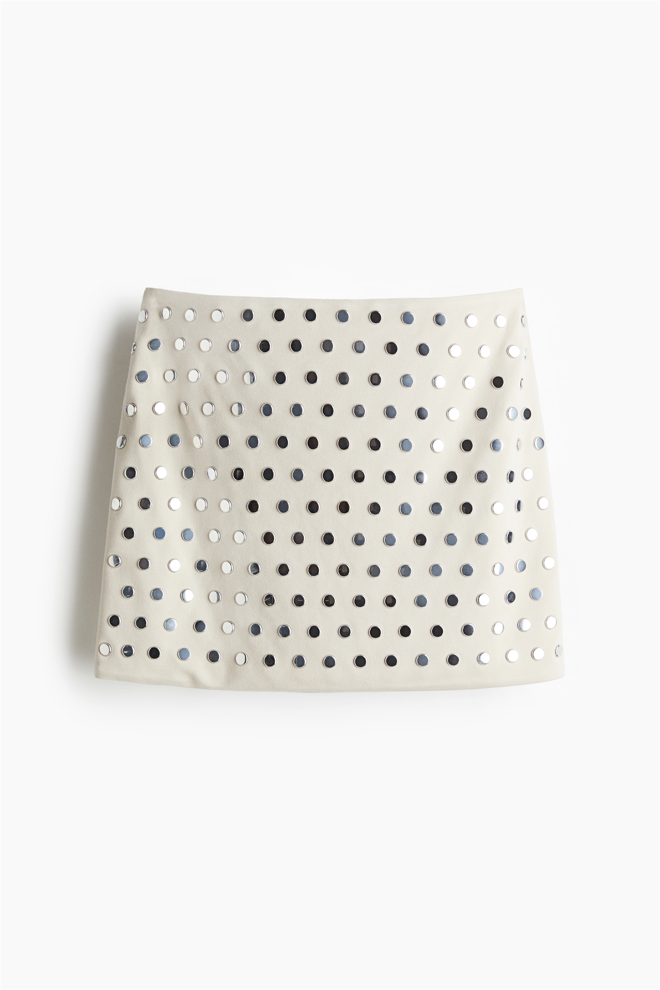 Облегающая юбка-мини из плотного джерси, украшенная металлическими шипами по всей поверхности. Скрытая эластичная резинка на талии и прямой подол. На подкладке.