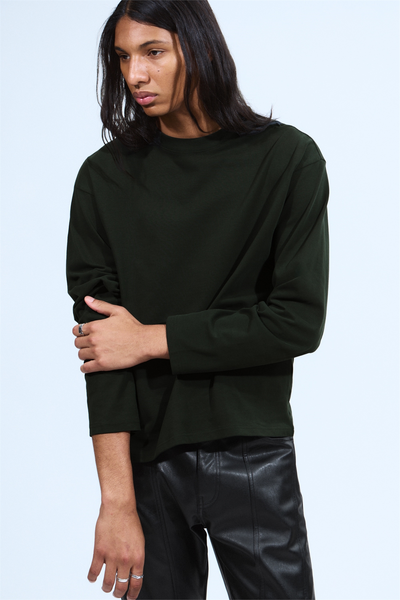 Футболка с длинными рукавами сшита из мягкой хлопковой ткани. Круглый вырез, свободный крой и двойные швы по краям.