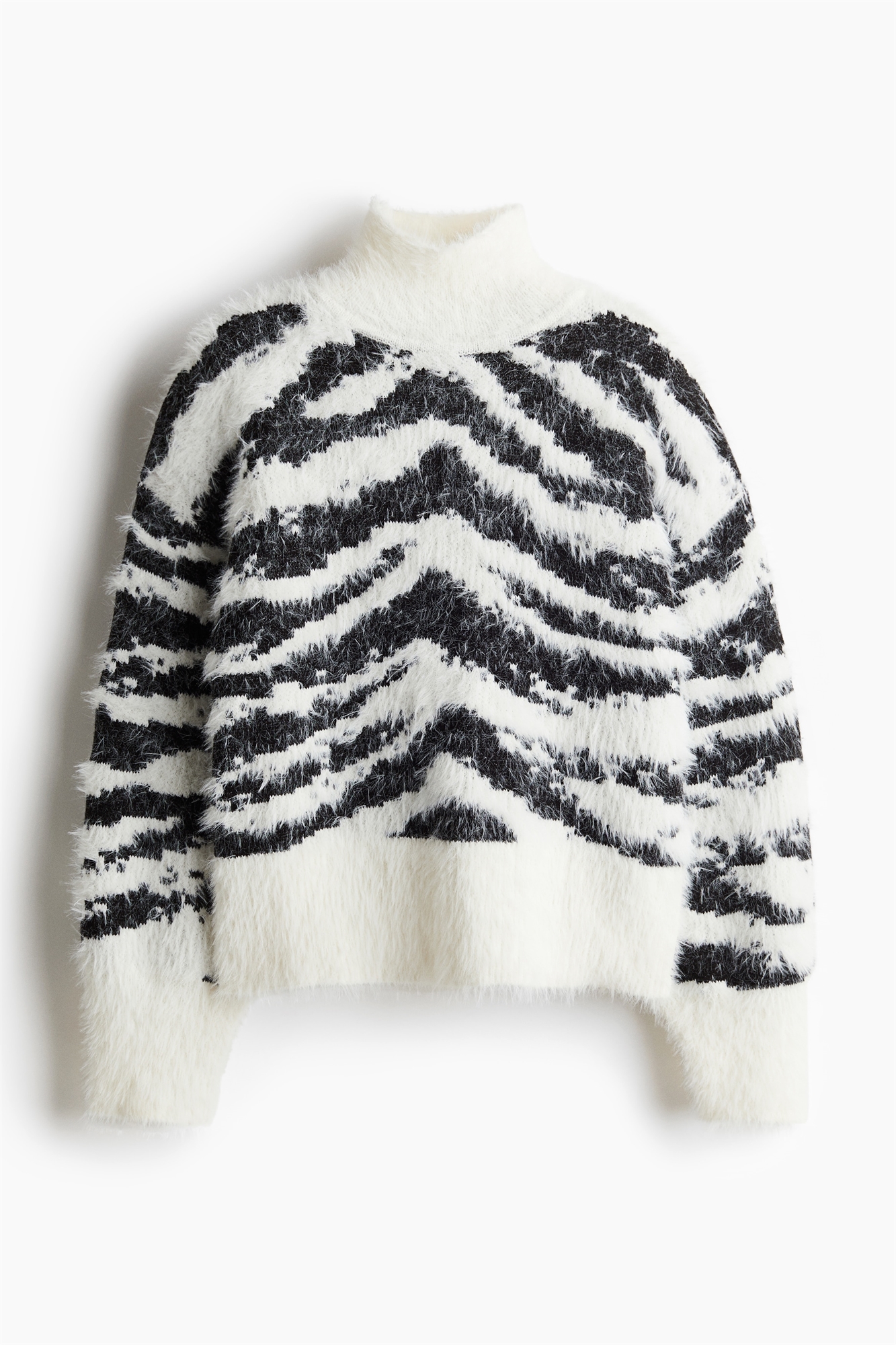 Джемпер свободного покроя из мягкого пушистого жаккарда с ребристой горловиной, спущенными плечами и длинными рукавами. Ребристые манжеты и подол.