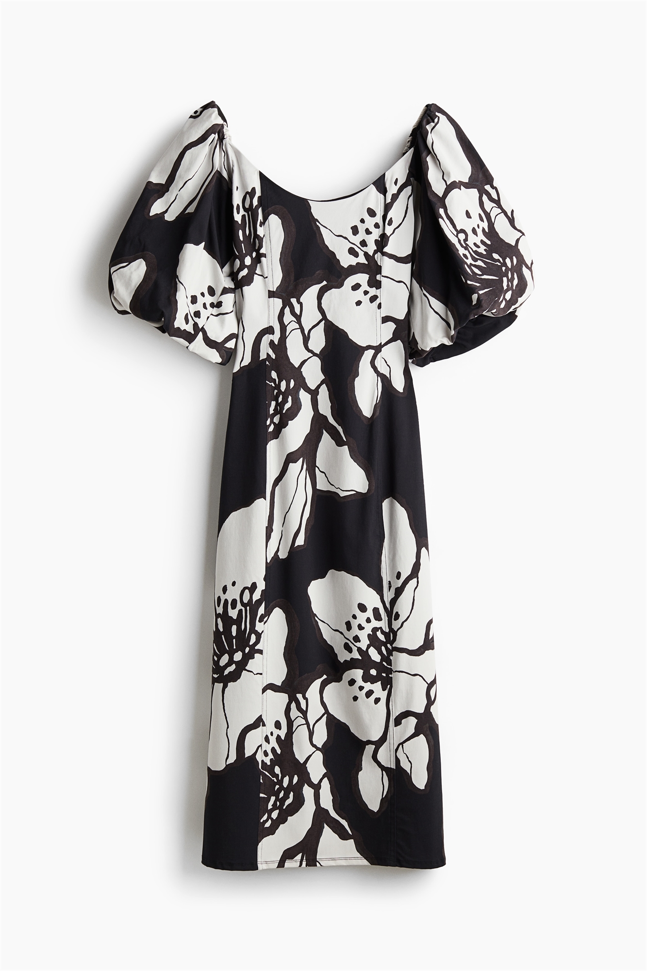 Приталенное платье длиной до колен из тканого материала с вырезом-лодочкой и объемными рукавами-баллонами длиной до локтя с узкими эластичными вставками на плечах и манжетах. Завязки и разрез сзади. На подкладке.