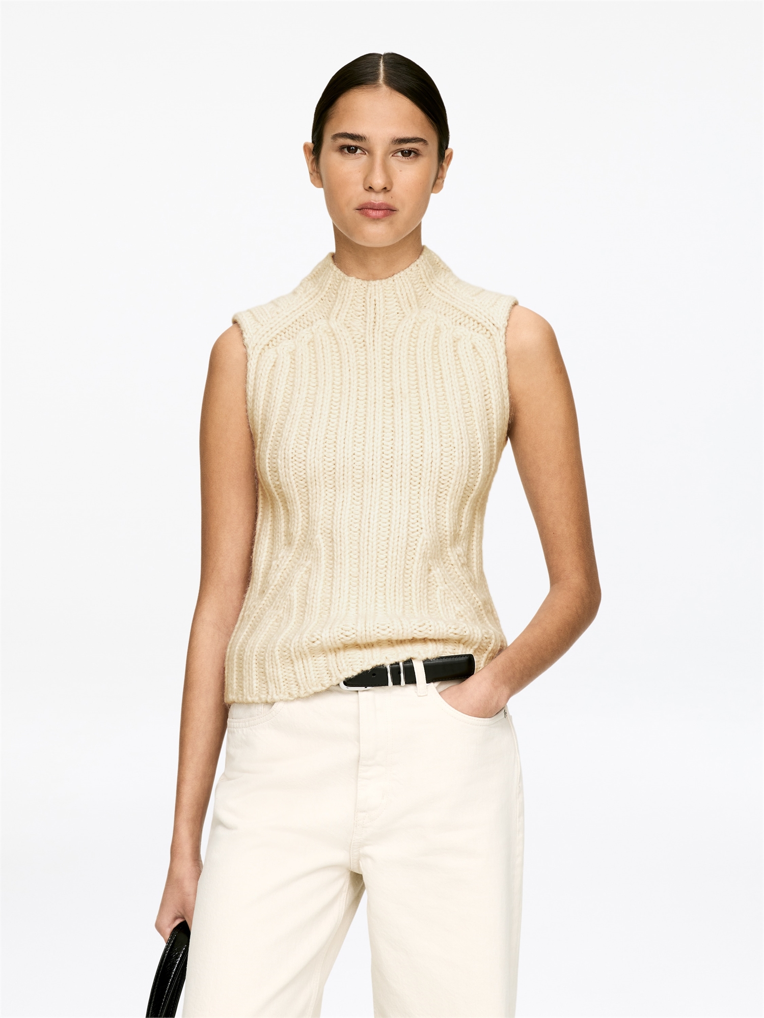Жилет из смеси хлопка, альпаки и шерсти. С высокой ребристой горловиной и обычным кроем. Жилет содержит 22% шерсти RWS (TE-00047206). Продукция, сертифицированная по стандарту ответственной шерсти (RWS), содержит шерстяное волокно с ферм, прошедших независимую сертификацию на соответствие требованиям по благополучию животных и землепользованию.