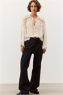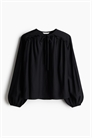 Блузка оверсайз из тканого материала с круглым вырезом и проймой с узкими завязками спереди. Длинные рукава-баллоны с узкими эластичными манжетами. Длинные рукава-баллоны с узкими эластичными манжетами.