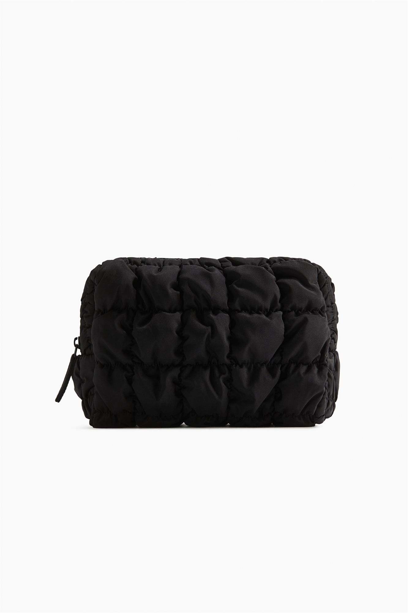 Стеганая косметичка с застежкой-молнией в верхней части. Глубина 8 см. Высота 12 см. Длина 20 см.