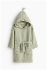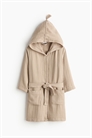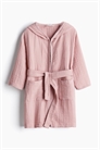 Халат из мягкого хлопкового муслина с капюшоном и игривой кисточкой. Съемный пояс-завязка на талии и два накладных кармана спереди.