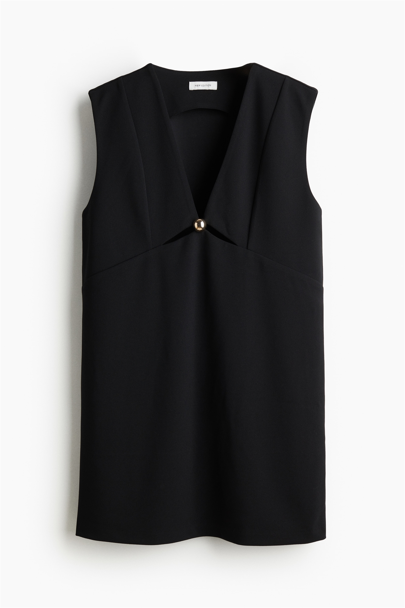 Короткое платье без рукавов из крепового джерси с глубоким V-образным вырезом с небольшими вырезами и металлической пуговицей золотистого цвета.