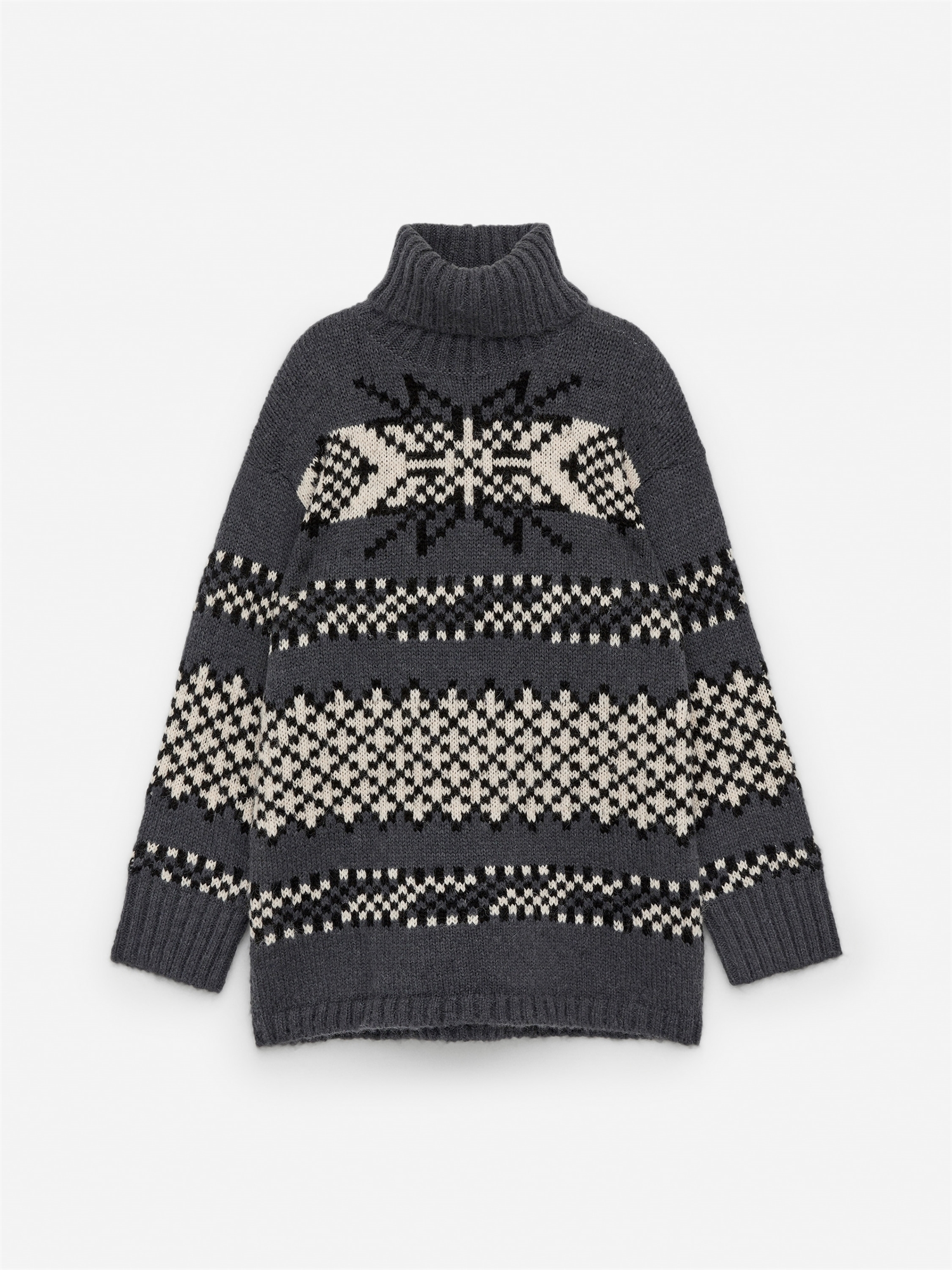 Джемпер с жаккардовой вязкой из смеси шерсти и альпаки. С вырезом-рулоном и ребристой отделкой. Расслабленный крой. Этот фасон содержит 44% альпаки RAS и 56% шерсти RWS (TE-00047206). Изделия, сертифицированные по стандартам Responsible Wool Standard (RWS) и Responsible Alpaca Standard (RAS), содержат шерсть и волокно альпака с ферм, прошедших независимую сертификацию на соответствие требованиям по благополучию животных и землепользованию.