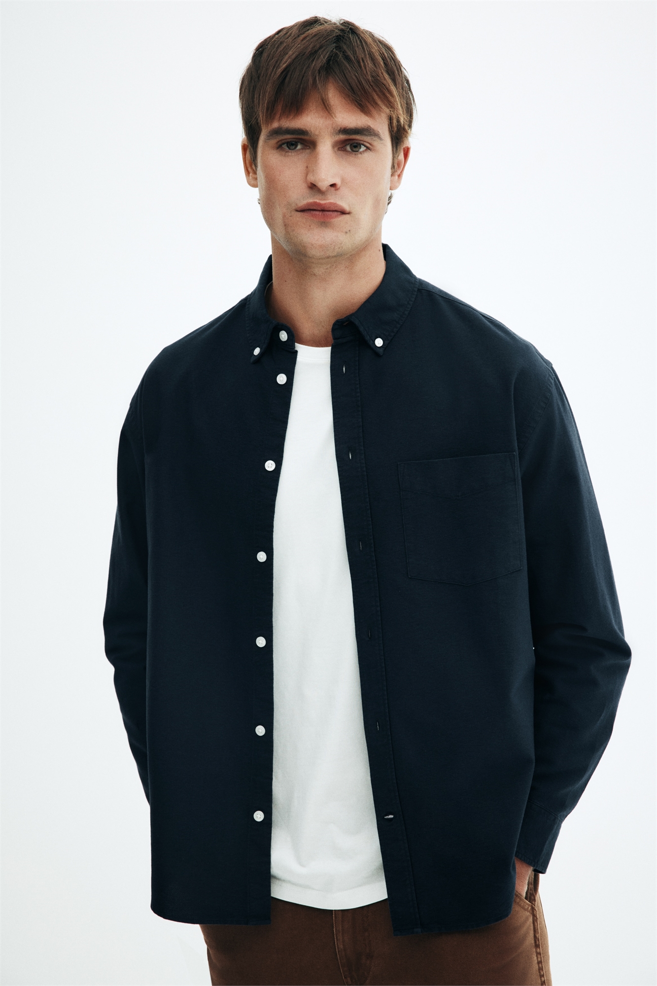 Рубашка из оксфордского хлопка с отложным воротником на пуговицах, классической передней частью, передом и открытым нагрудным карманом. Длинные рукава с манжетами на пуговицах и рукавной планкой с застежкой на пуговицу. Аккуратный закругленный подол. Регулярный крой для комфортной носки и классического силуэта.