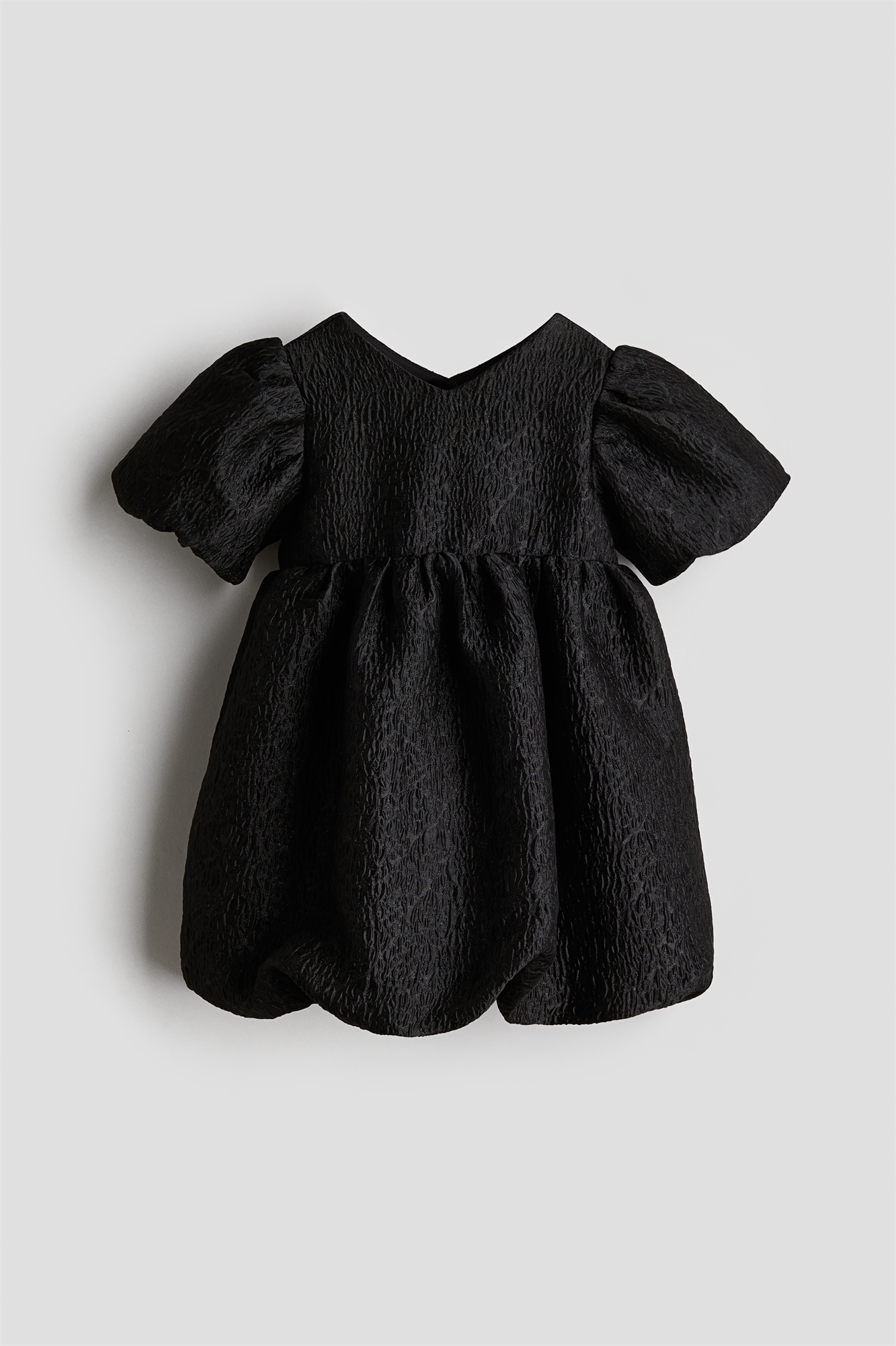 Платье из мерцающего жаккарда с юбкой-баллон. V-образный вырез, короткие пышные рукава с манжетами в складку и объемная юбка со складками на талии. Пуговицы по спинке. На подкладке.