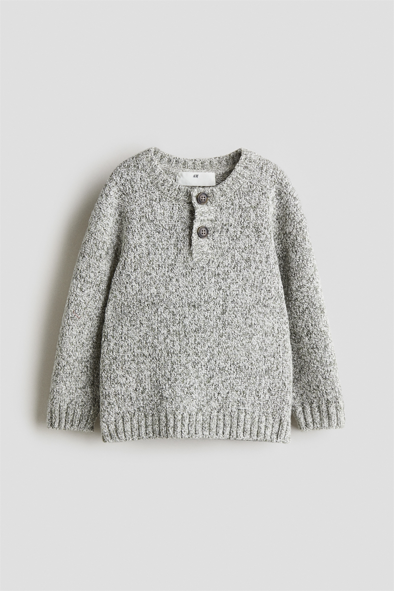 Мягкий трикотажный джемпер с круглым вырезом в рубчик, застежкой на пуговицах, слегка спущенными плечами и ребристыми манжетами и подолом.