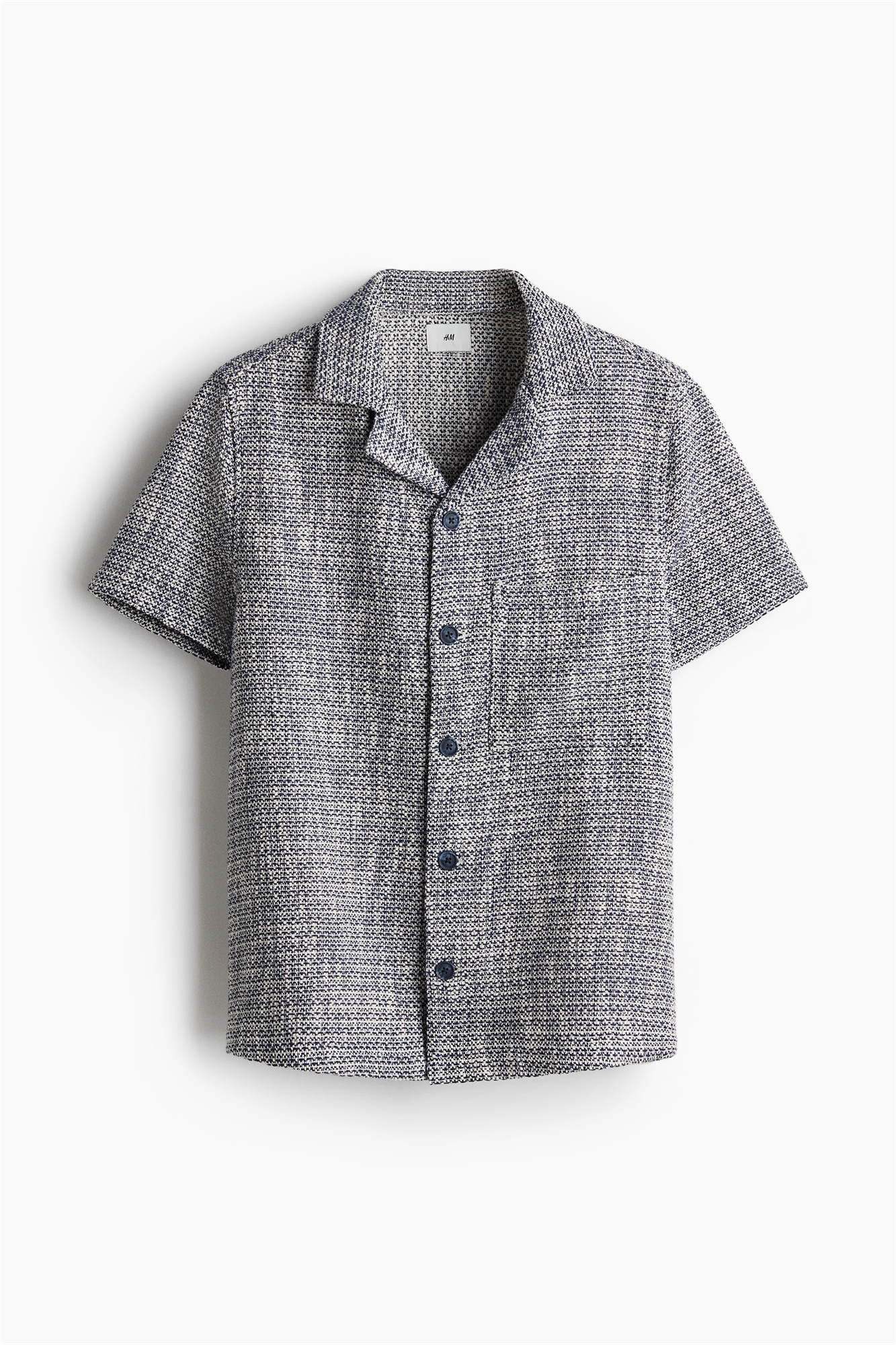 Рубашка с короткими рукавами из хлопкового микса с фактурным плетением, курортным воротником, французской застежкой спереди, ярмом сзади, открытым нагрудным карманом и прямым покроем. Регулярный крой для комфортной носки и классического силуэта.