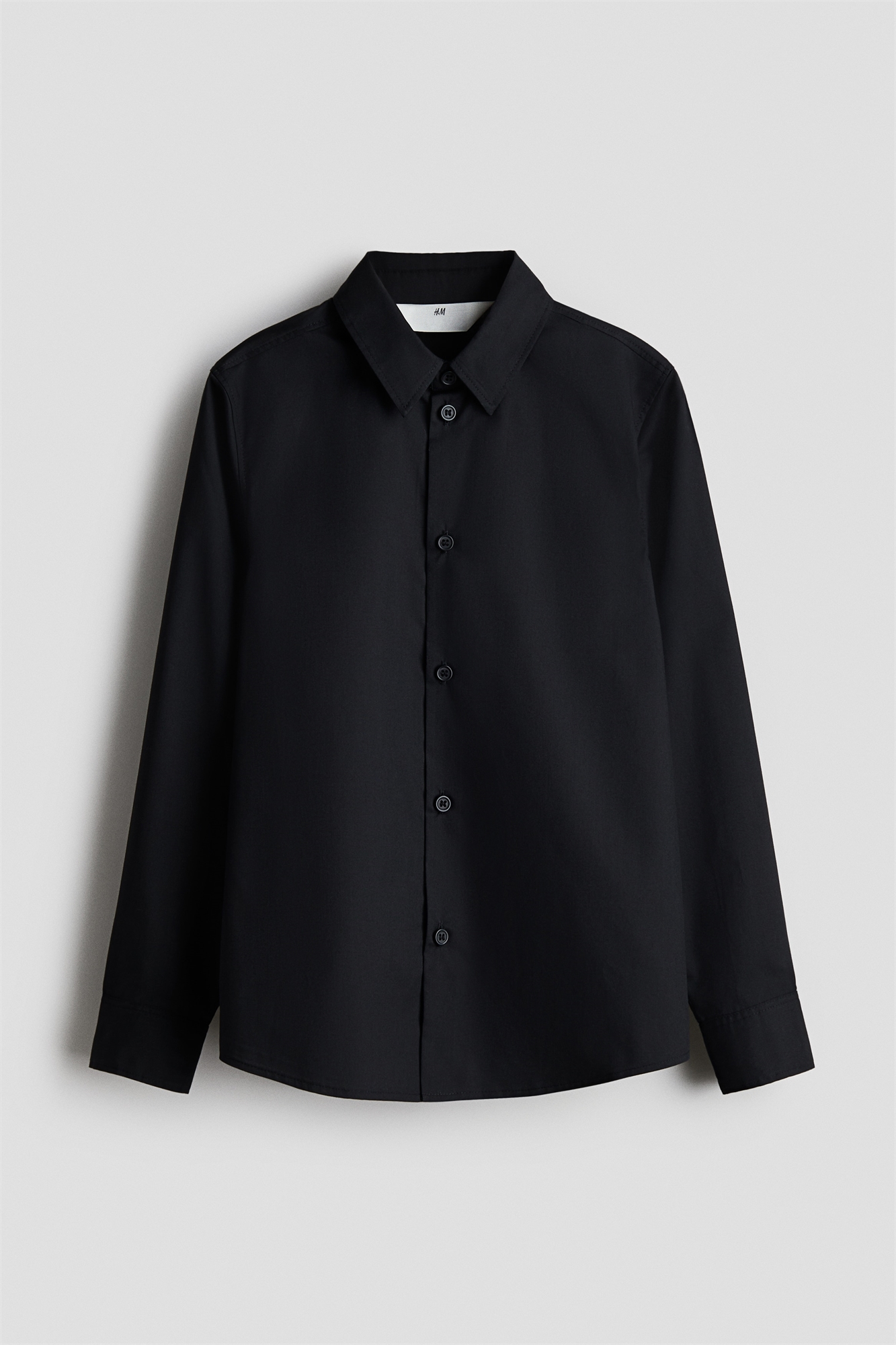 Рубашка из хрустящего поплина с легкой глажкой. Отложной воротник, застежка на пуговицы спереди, длинные рукава с манжетами на пуговицах и закругленный подол.