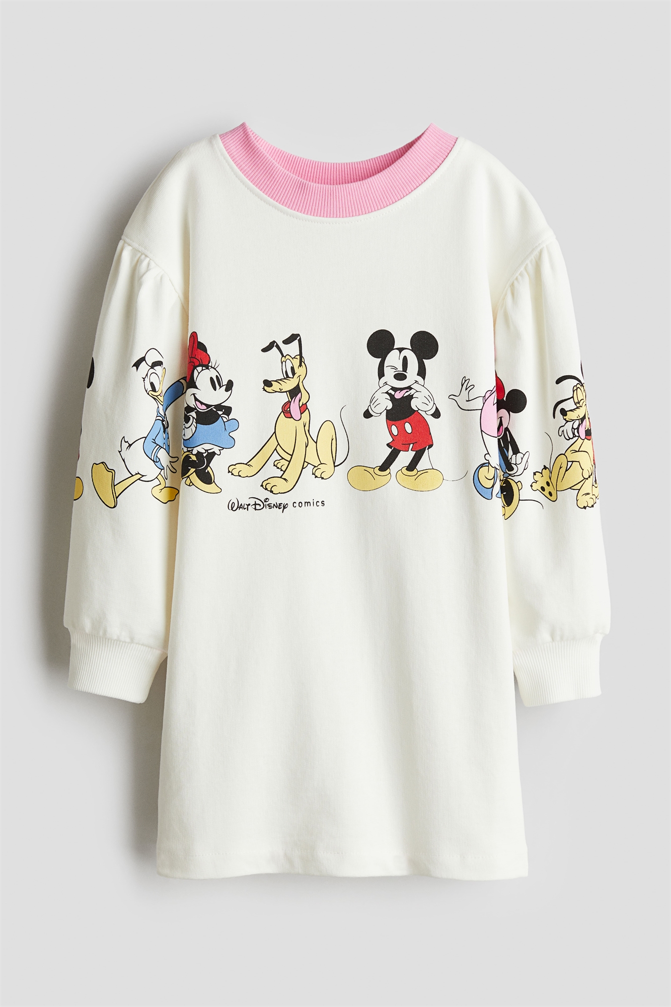 Платье из принтованной, легкой ткани свитшот. Круглый вырез, спущенные плечи со сборками и длинные рукава. Окантовка вокруг выреза и на манжетах.