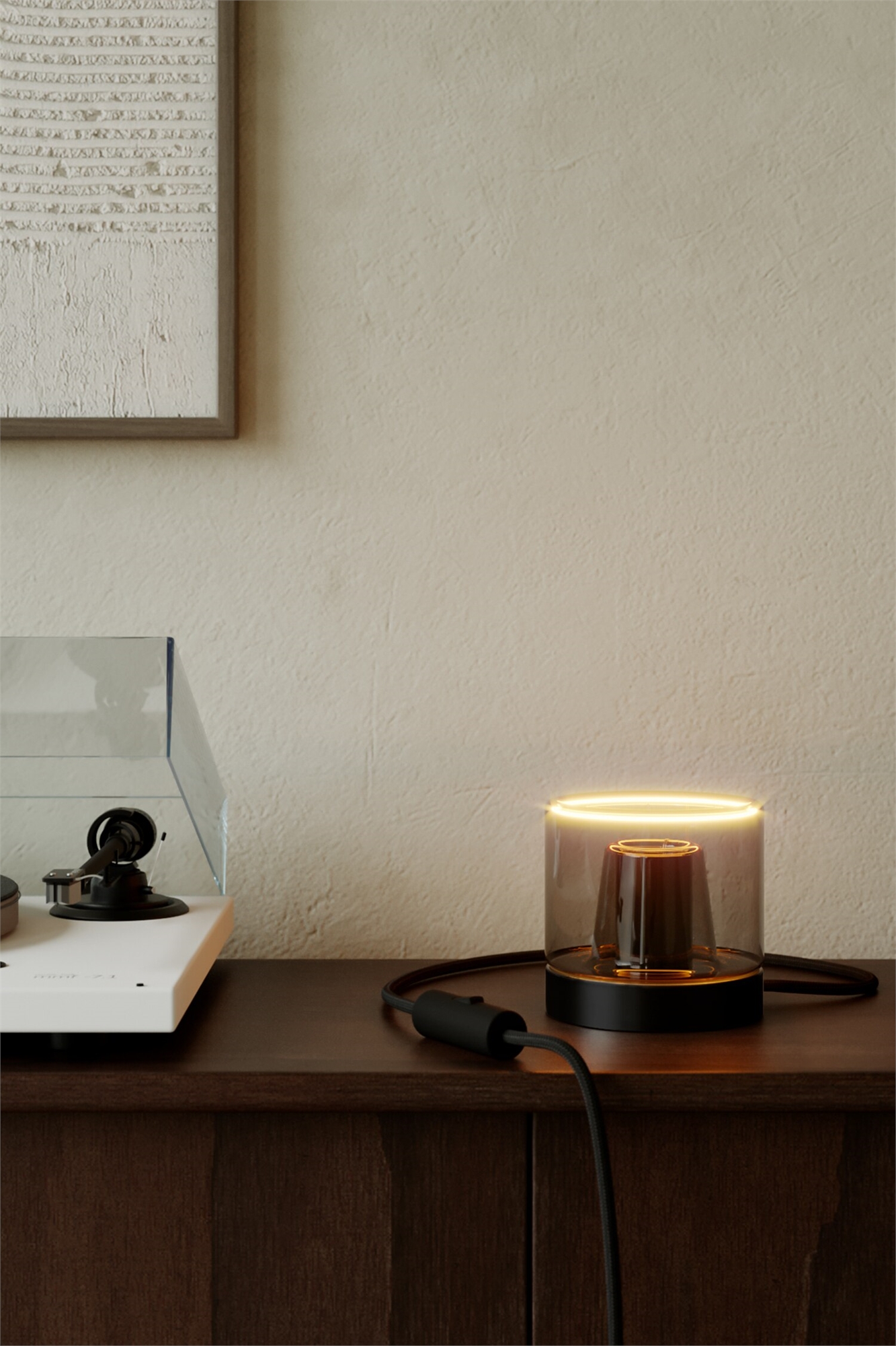 Настольная лампа с металлическим основанием и лампочкой в форме кольца с нитью накаливания, проходящей по краю. Кабель с тканевой оболочкой, выключателем и патроном E27. Включает лампу 6 Вт 380 Лм. Диаметр лампы 12 см. Высота около 22 см. Длина кабеля 200 см.