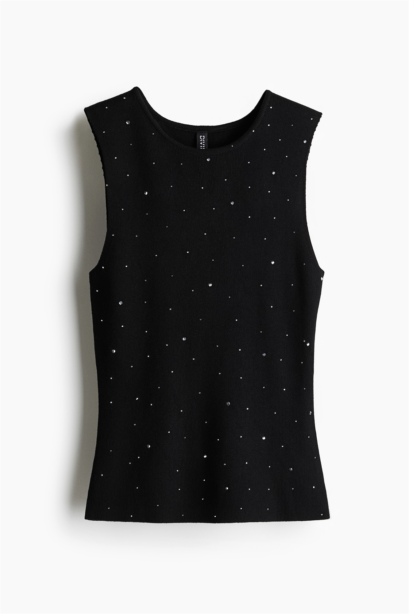 Короткий приталенный жилет-топ из ребристого трикотажа, украшенный по всему периметру нежными стразами. Круглый вырез и прямой подол.
