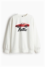 Топ оверсайз из принтованной толстовки с круглым вырезом, отделанным ребрами, спущенными плечами и длинными рукавами. Манжеты и подол отделаны ребрами жесткости.
