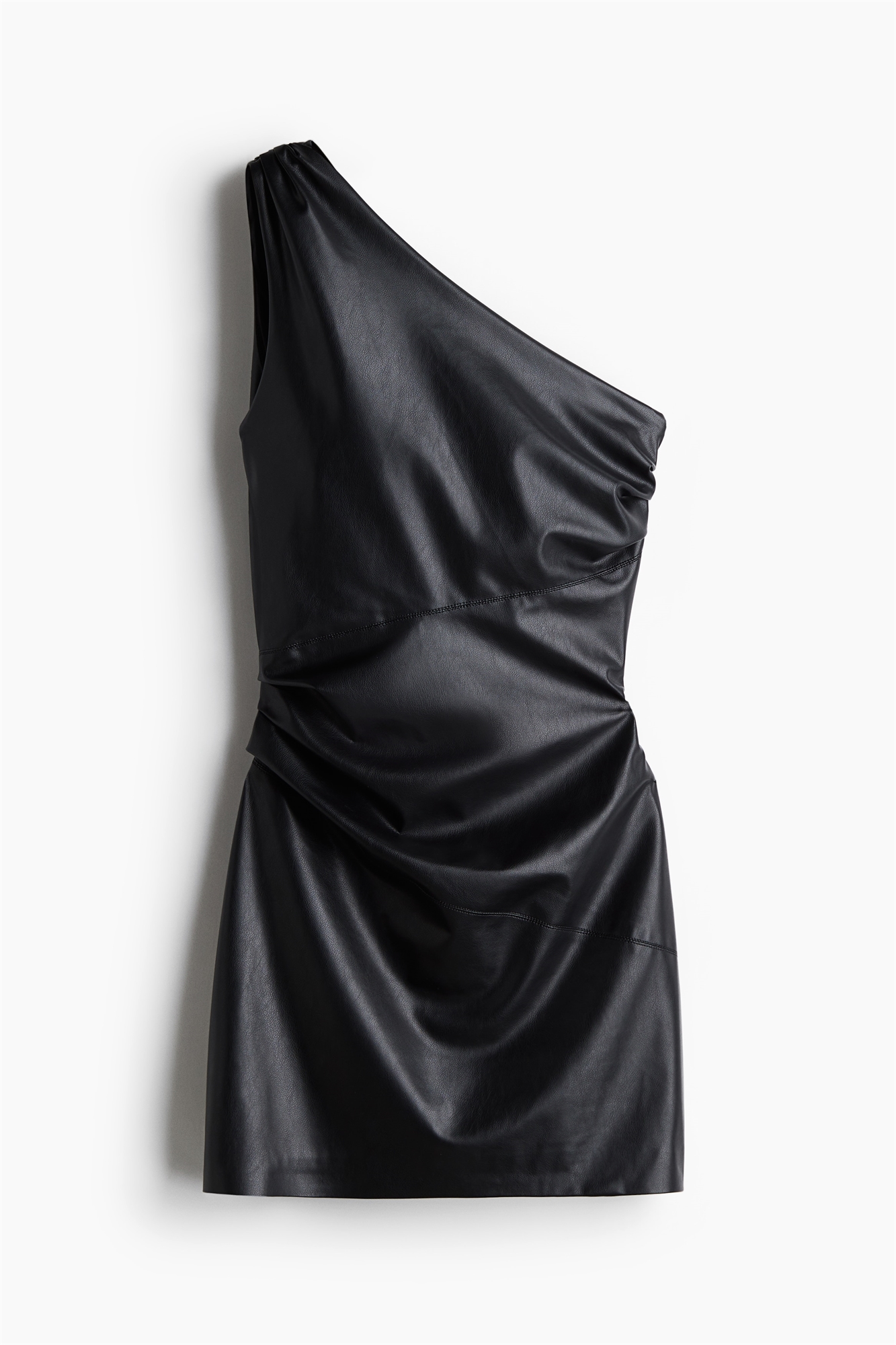 Короткое приталенное платье на одно плечо из лакированной ткани с широкой бретелью и асимметричным вырезом. Плиссировка на плече и с одной стороны создает эффект легкой драпировки. Диагональные швы спереди и сзади и потайная застежка-молния с одной стороны. Подкладка из джерси.