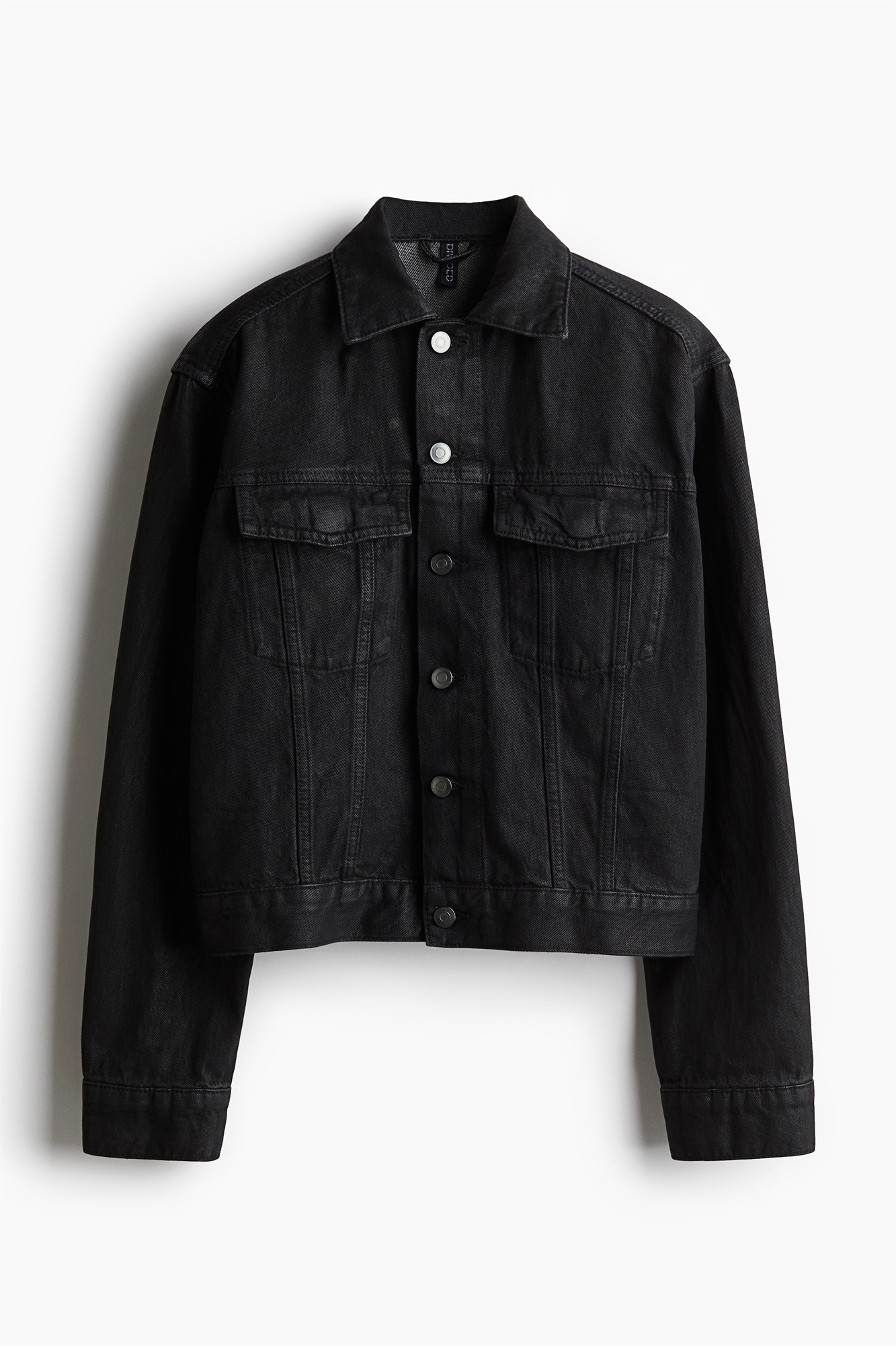Куртка в стиле дальнобойщика из жесткого хлопкового денима с воротником, металлическими пуговицами спереди, направленными вперед плечевыми швами и ярмом спереди и сзади. Слегка спущенные плечи, манжеты на пуговицах и накладные нагрудные карманы с потайной кнопкой.