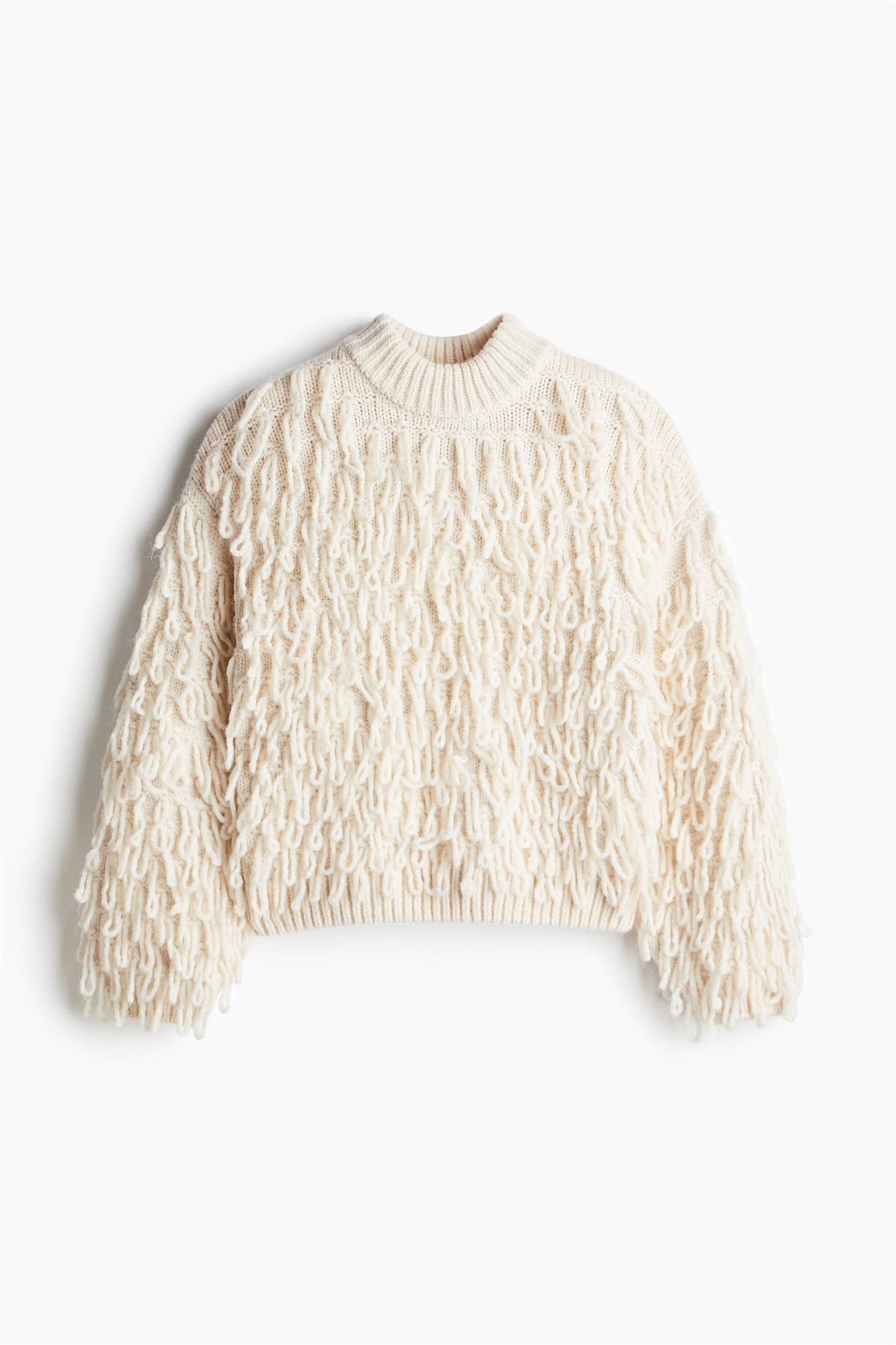 Короткий джемпер свободного кроя из мягкого трикотажа с петлями из пряжи по всей поверхности. Круглый вырез с ребристой отделкой, спущенные плечи и длинные рукава. Ребрышки на манжетах и подоле.