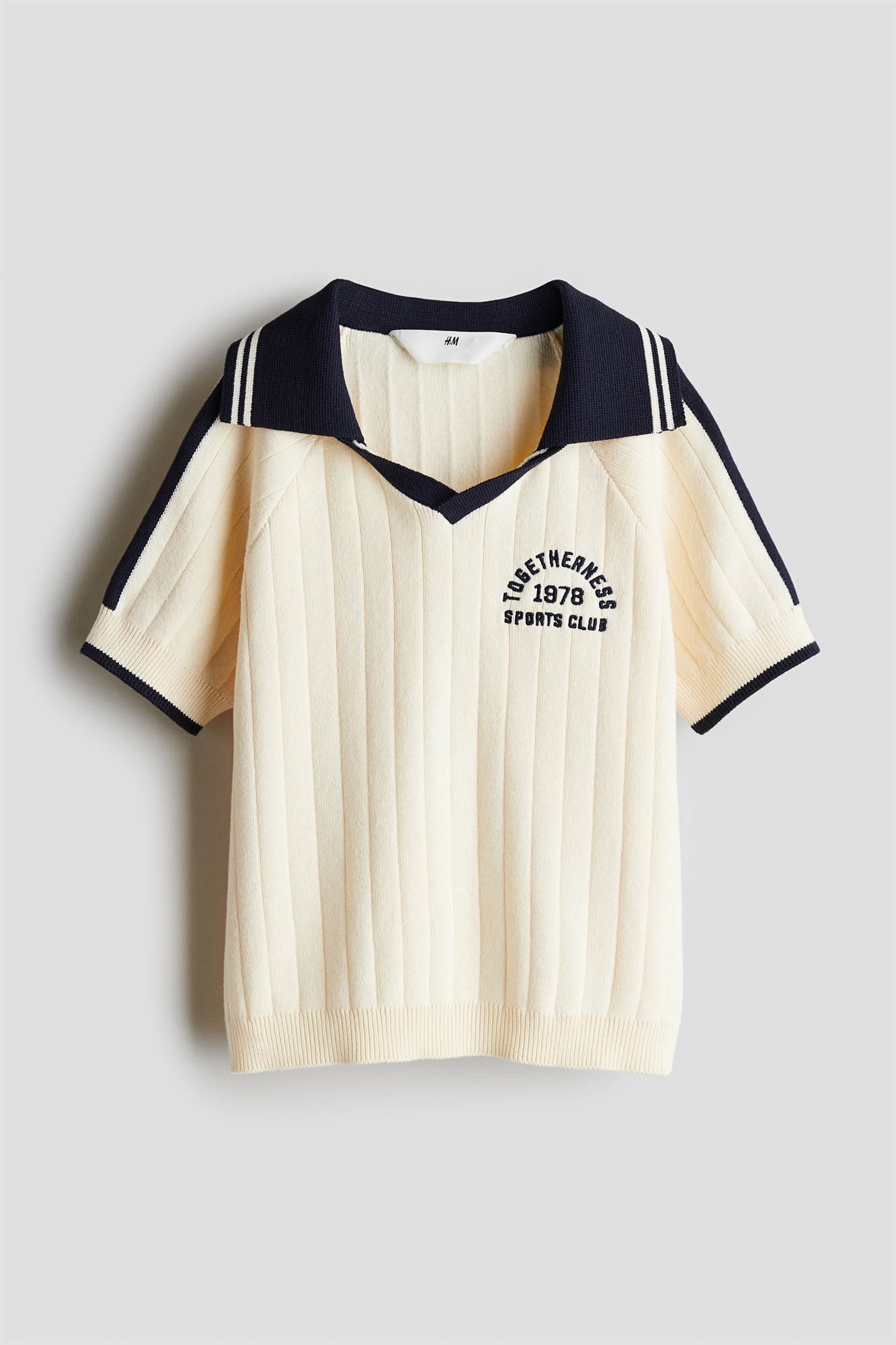 Рубашка-поло с короткими рукавами из мягкого хлопка с ребристой вязкой и контрастными цветными деталями. Воротник с ребристой отделкой, V-образный вырез и вышитый текстовый мотив спереди. Манжеты и подол в рубчик.