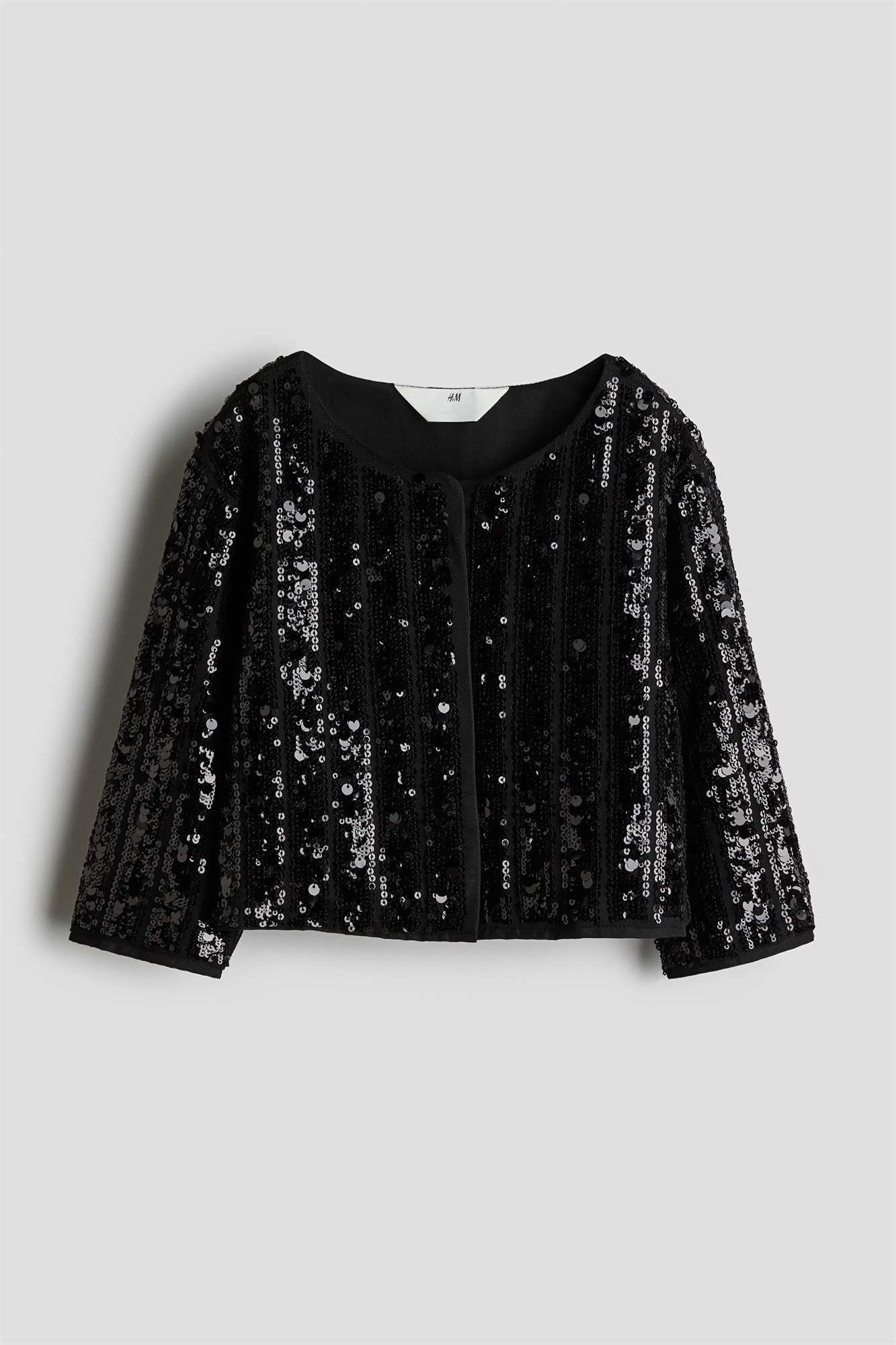 Сверкающий блейзер из сетки с блестками. Круглый вырез, потайные застежки спереди и длинные рукава. На подкладке.