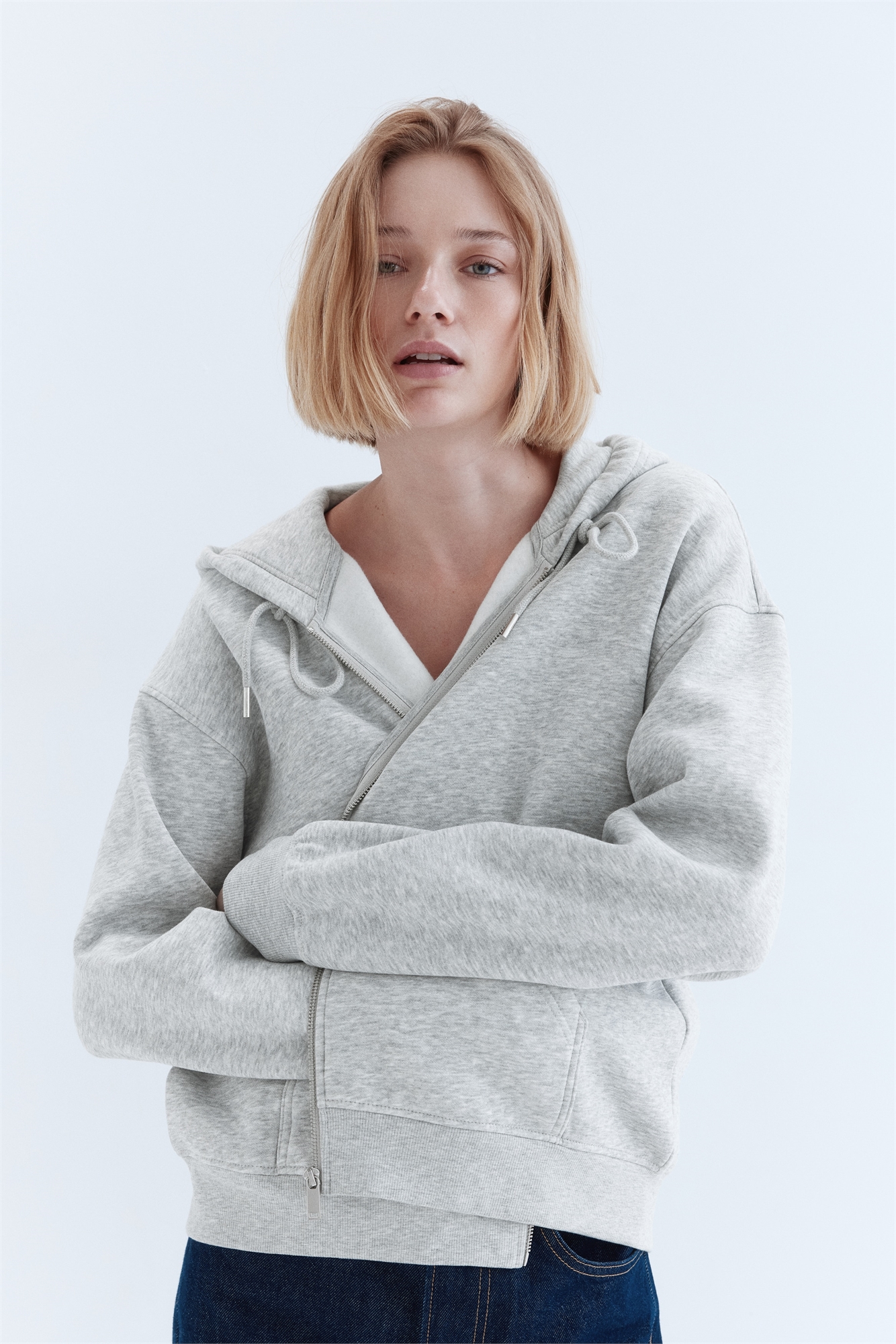 Толстовка из толстовочной ткани с мягким начесом внутри. Капюшон на подкладке, затягивающийся капюшон, застежка-молния спереди, карманы-кенгуру, спущенные плечи и длинные рукава. Манжеты и подол в рубчик.