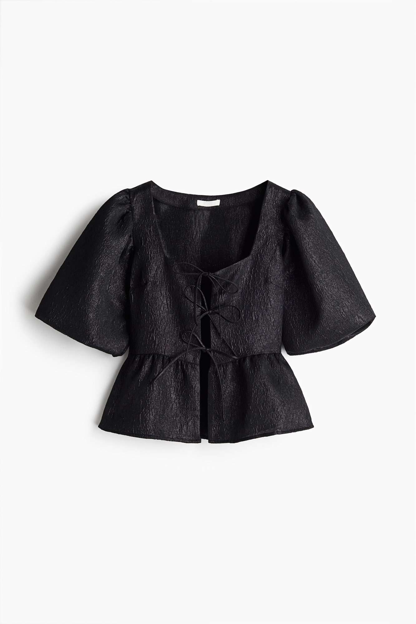 Короткая блузка из жаккардового переплетения с блестящими нитями. Квадратный вырез и открытая передняя часть с тремя парами узких завязок. Рукава-баллоны на подкладке, длиной до локтя, шов на талии и расклешенный пеплум.