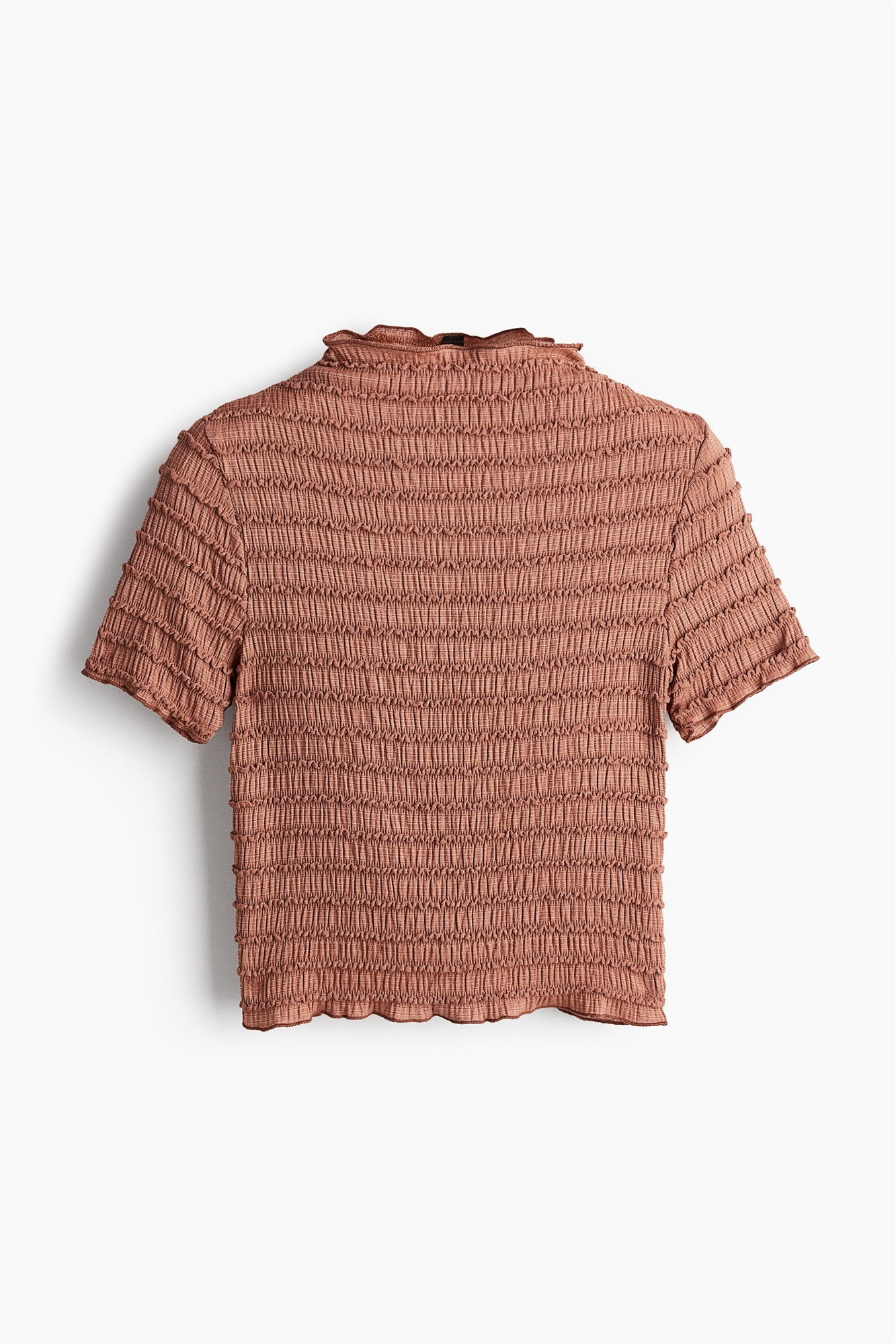 Короткий приталенный топ из трикотажа с оверлоком по краям. Воротник-стойка, короткие рукава и прямой подол.