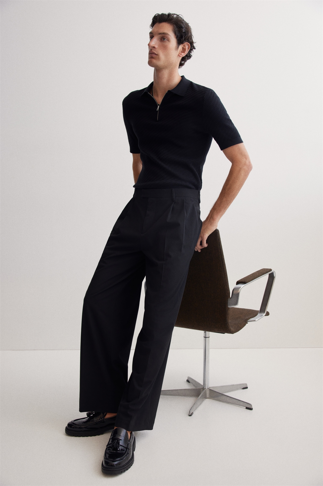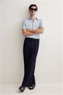 Приталенные брюки мягкого плетения со складками в верхней части, ширинкой на молнии и удлиненным поясом с потайной застежкой на крючок и планку. Диагональные боковые карманы, втачные задние карманы на пуговице и широкие прямые ноги со складками. Свободный крой для пышного, но не чрезмерно большого силуэта.