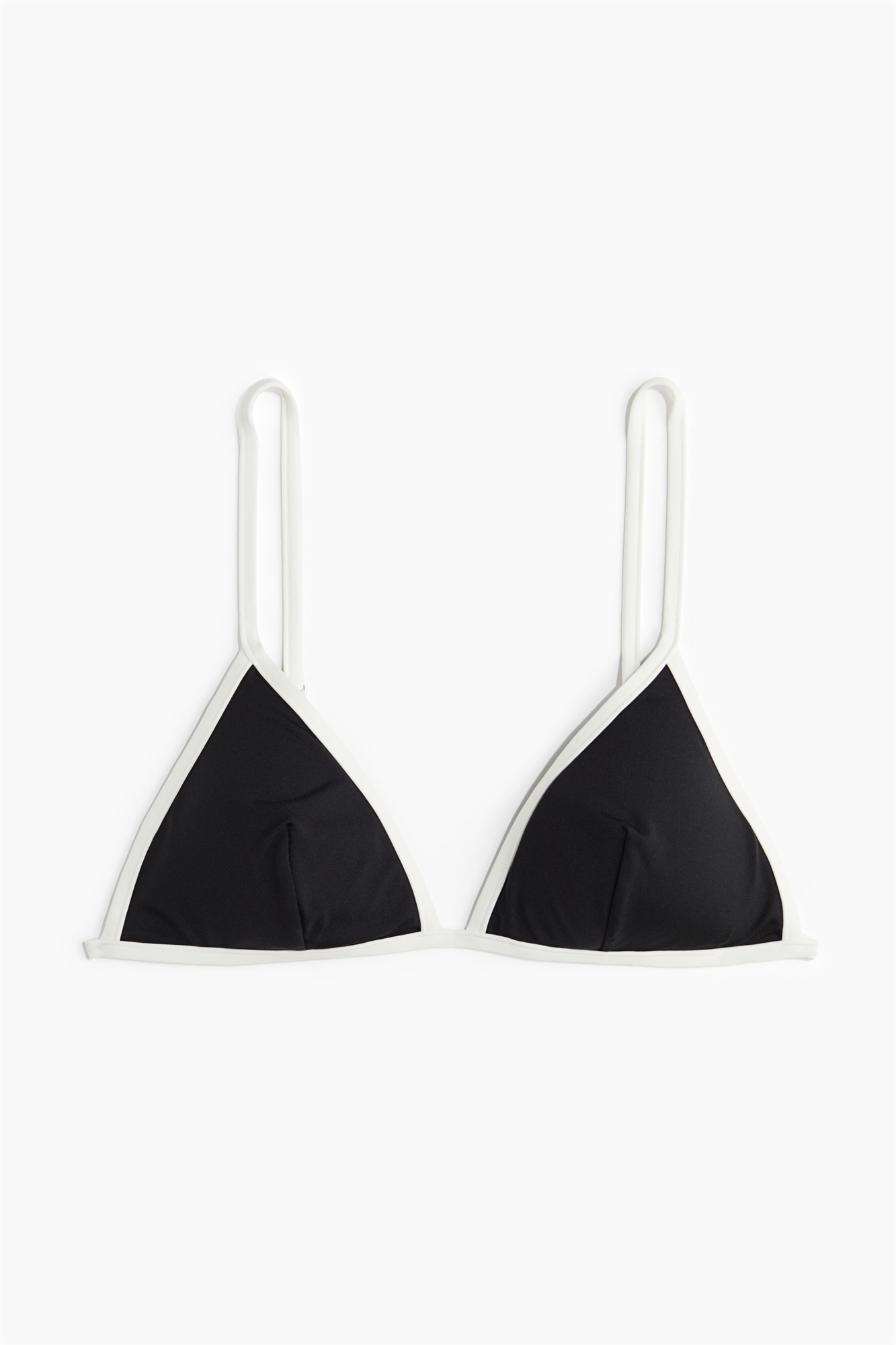 Бикини-треугольник без подкладки с узкими регулируемыми бретелями и завязками сзади. Чашечки со съемными вставками, придающими форму бюсту и обеспечивающими хорошую поддержку.