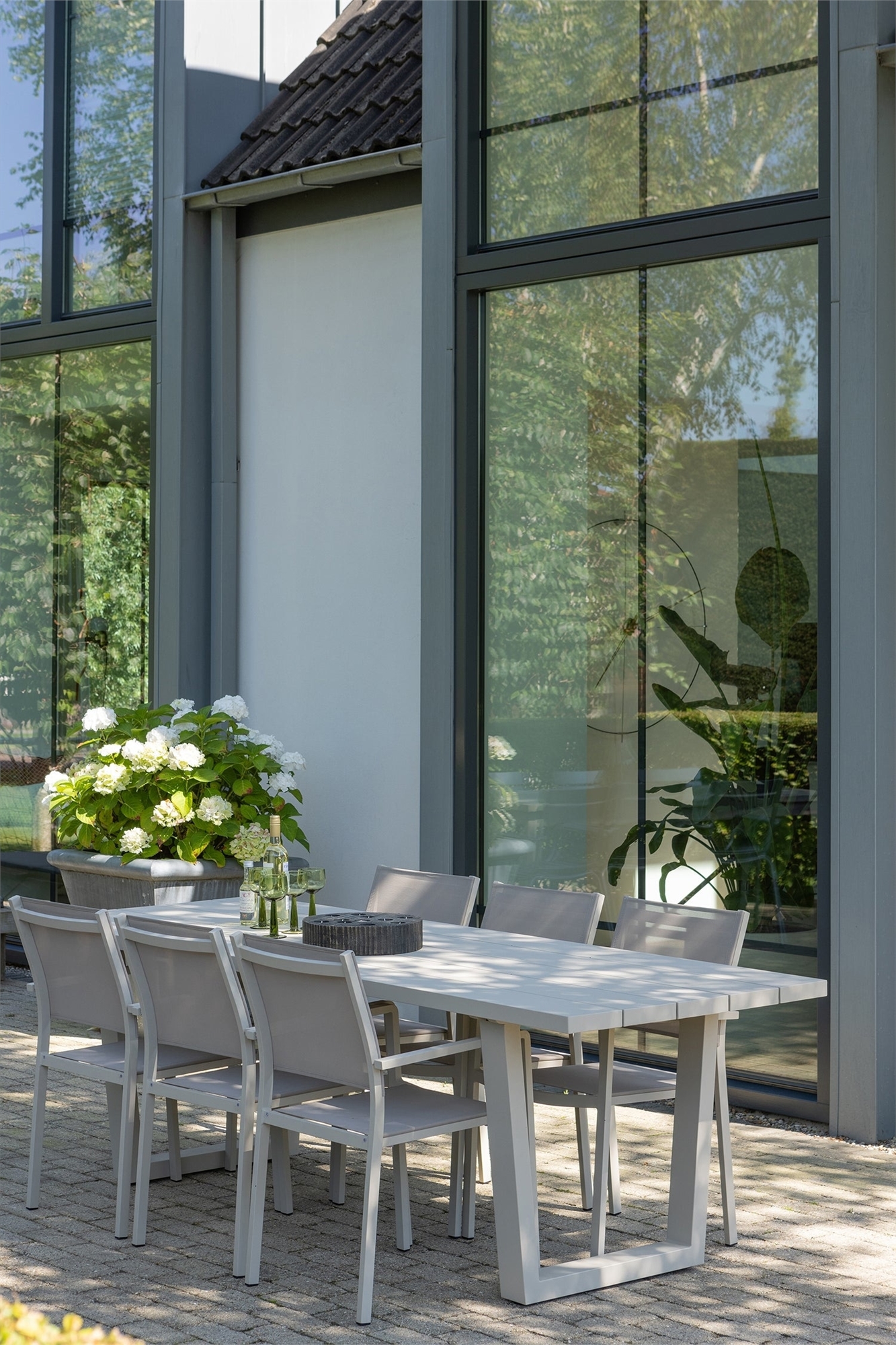 Идеальный обеденный стол для вашей столовой на открытом воздухе: обеденный стол Bear из коллекции Exotan для открытого воздуха впечатляет своим светлым, ярко окрашенным алюминием. Стильная рама на ножках сохраняет столешницу высокой и сухой, что идеально подходит для всего сезона на открытом воздухе. Алюминий очень легкий, прочный и гибкий. Алюминий в наших коллекциях подвергается различным видам обработки и отделки. Размеры изделия следующие: Высота 75 см, ширина 240 см, глубина 87 см, толщина столешницы 4 см, высота ножек 71 см, толщина каркаса ножек 10 см, расстояние от края стола до ножки 29 см, длина каркаса ножек со стороны пола 60 см, расстояние между ножками 162 см, грузоподъемность 150 кг, вес 39 кг.