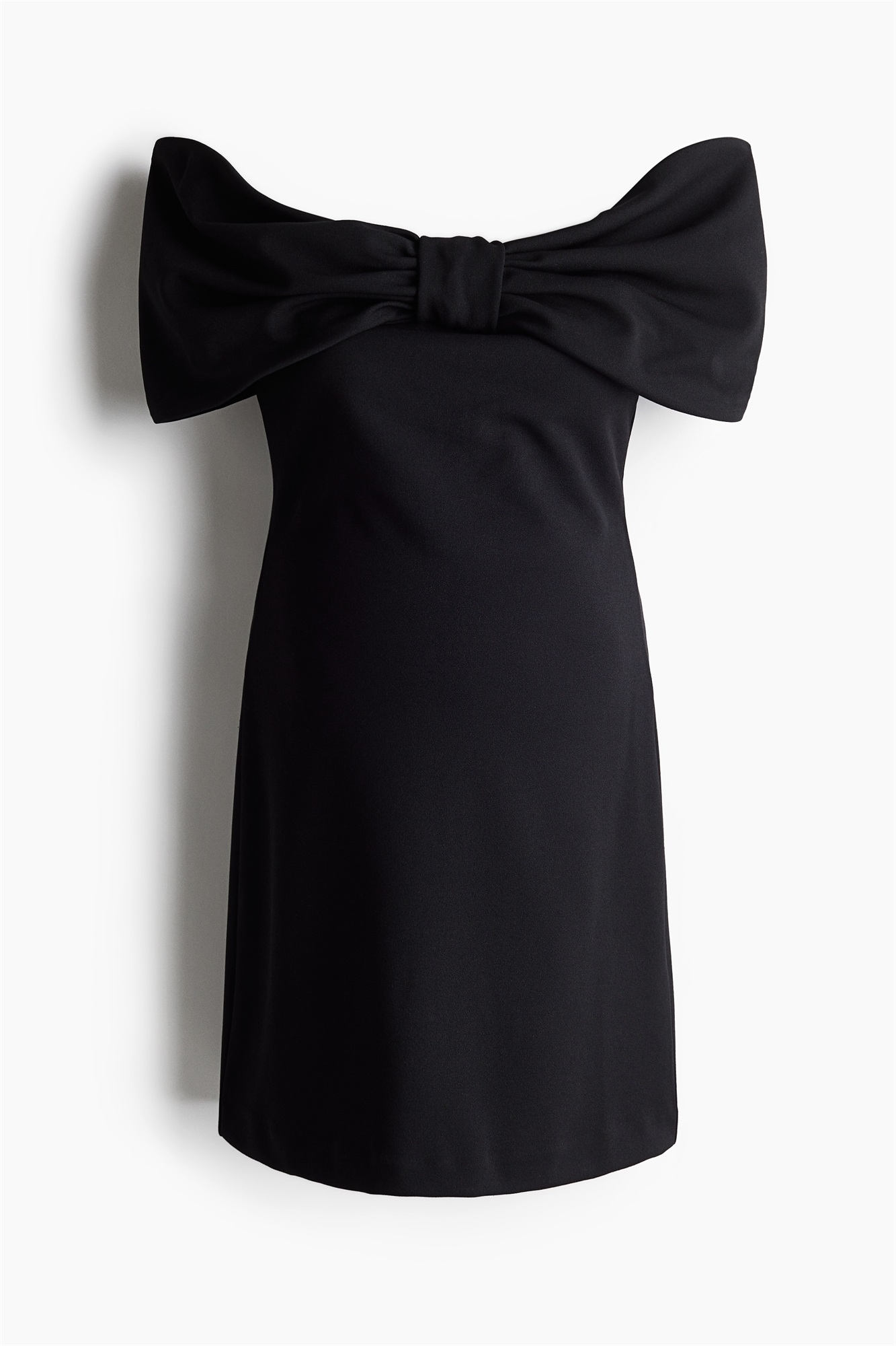 Короткое приталенное платье без плеч из мягкого джерси с большим разрезом в форме банта в верхней части и потайной застежкой на молнию и крючок с глазками сзади.