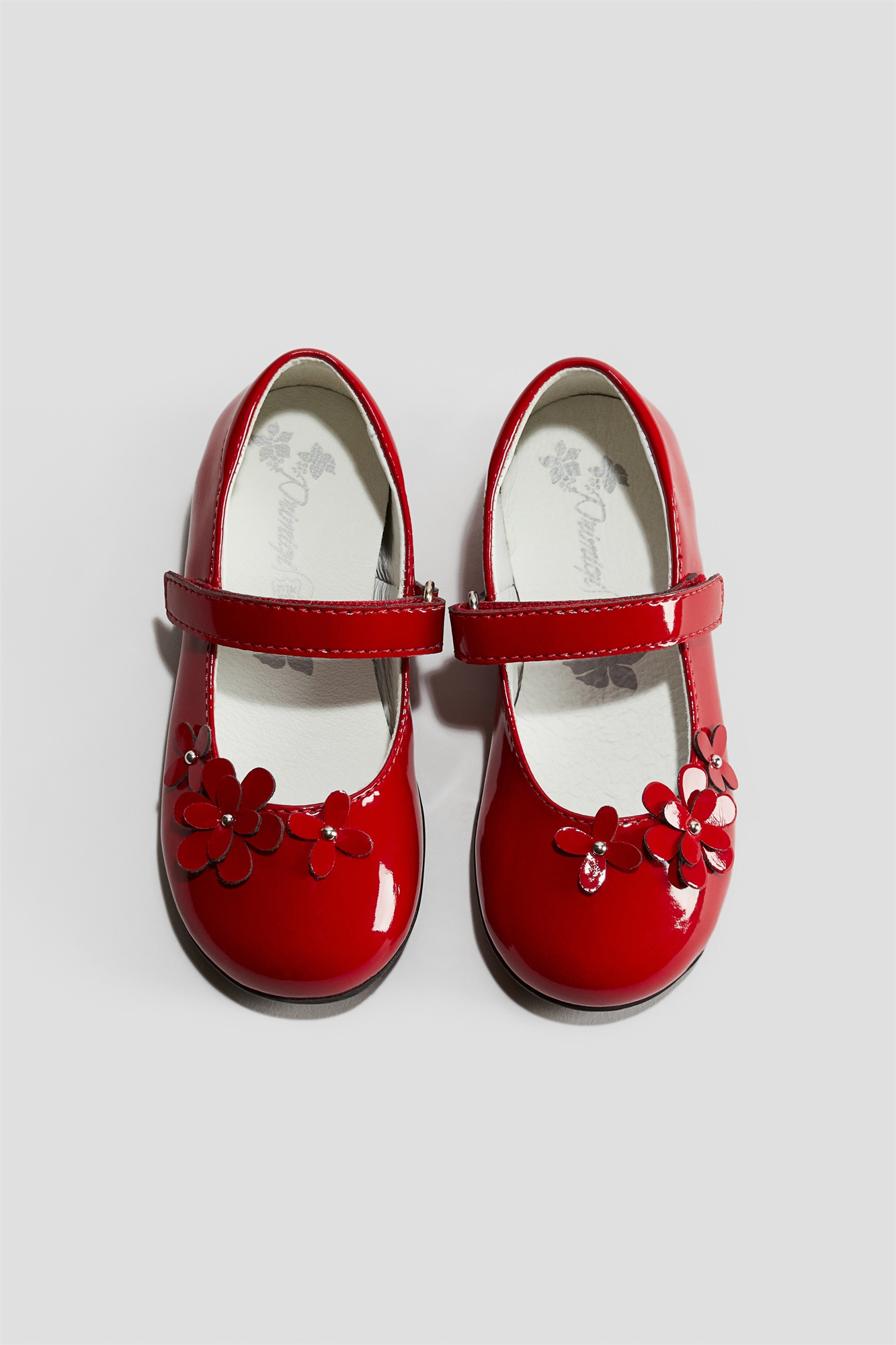 Балеринки Mary-Jane из лакированной кожи. Застежка на липучке на заднике. Декоративные лакированные цветы с шипами на мыске. Закругленный носок. Кожаная подкладка и стелька. Тонкая резиновая подошва с небольшим каблуком.