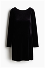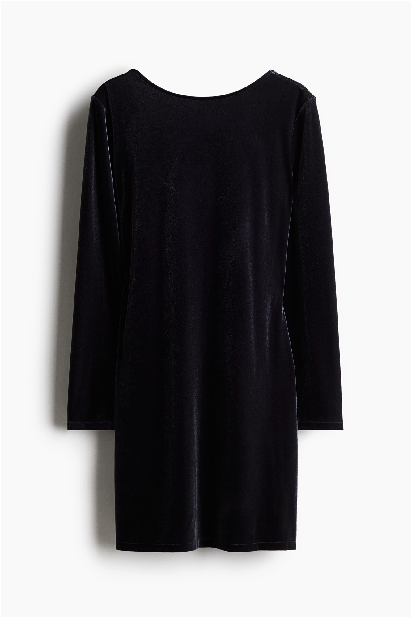 Короткое приталенное платье из мягкого велюра с глубоким круглым вырезом сзади и длинными рукавами.