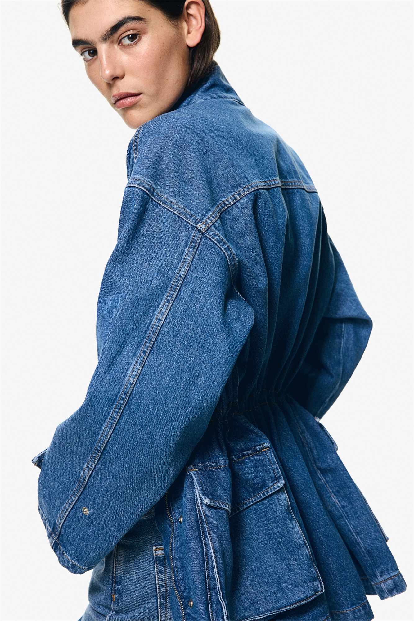Куртка из жесткого хлопкового денима с воротником-стойкой, застежкой-молнией и ветрозащитным клапаном с потайными кнопками спереди. Свободный крой с вырезом сзади, спущенными плечами и длинными рукавами с регулируемой планкой и кнопками на манжетах. Внутренний шнурок на талии. Нагрудные и передние карманы с клапаном и прижимной планкой. Без подкладки.