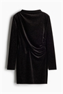 Короткое приталенное платье из мягкой эластичной ткани с черепаховой горловиной и длинными рукавами. Накладки на плечах и сборки на одном плече и на противоположной стороне талии создают эффект драпировки и подчеркивают силуэт.