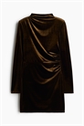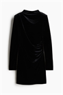 Короткое приталенное платье из мягкой эластичной ткани с черепаховой горловиной и длинными рукавами. Накладки на плечах и сборки на одном плече и на противоположной стороне талии создают эффект драпировки и подчеркивают силуэт.