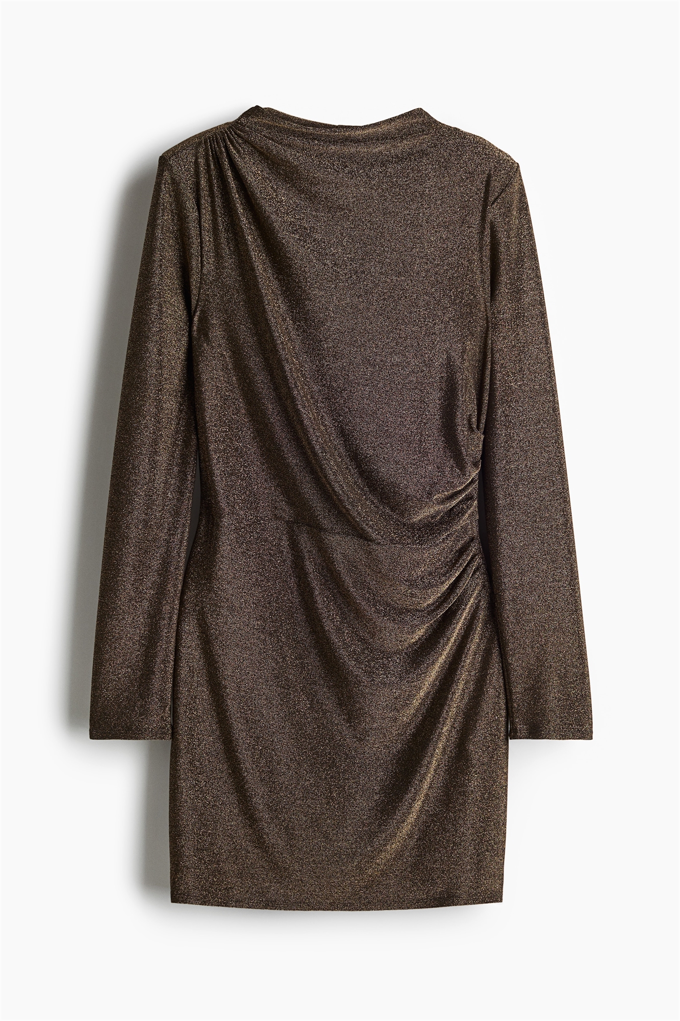 Короткое приталенное платье из мягкой эластичной ткани с черепаховой горловиной и длинными рукавами. Накладки на плечах и сборки на одном плече и на противоположной стороне талии создают эффект драпировки и подчеркивают силуэт.