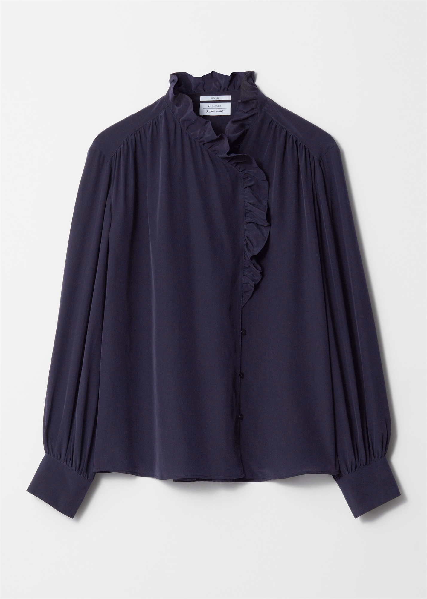 Шелковая блузка с рюшами, сборчатыми швами и воротником-стойкой. Застежка на пуговицы и манжеты со смещенным центром. Застежка на пуговицы Круглый вырез Длина блузки: 66 см / 25,9" (размер S)