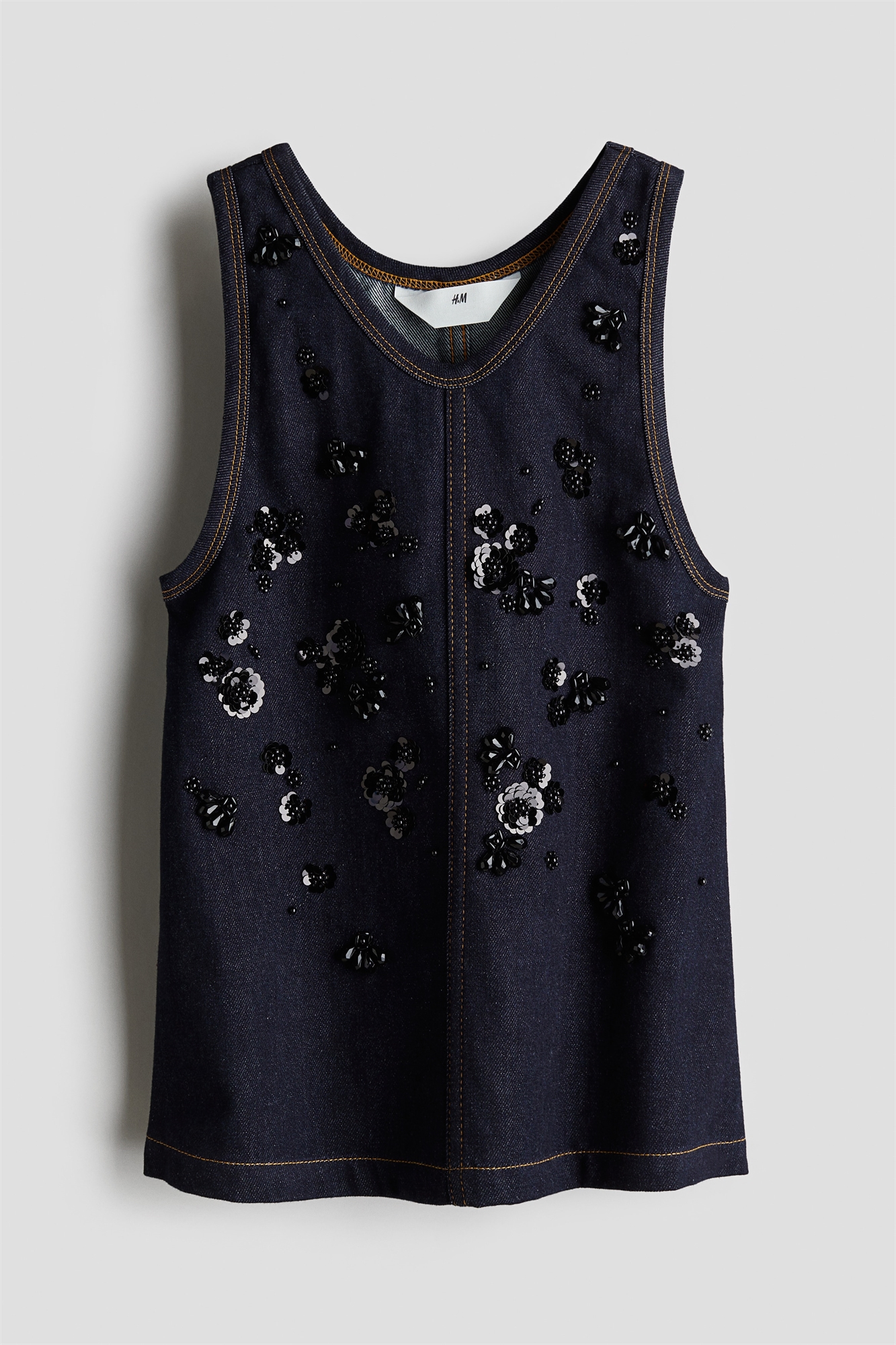 Платье без рукавов из хлопкового денима с V-образным вырезом и украшениями спереди.