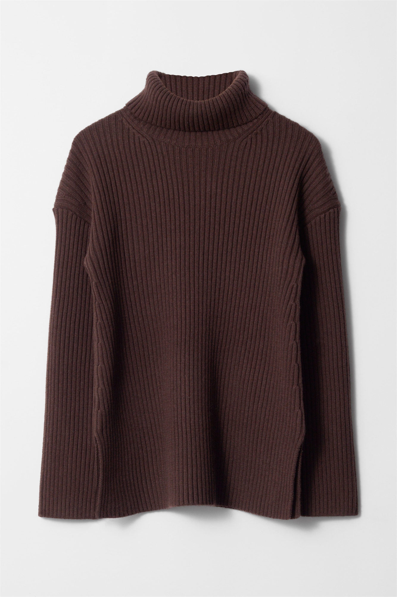 Джемпер с водолазкой из шерсти в рубчик. У него спущенные плечи, узкие рукава и боковые разрезы. • Regular fit • 55% шерсти RWS TE-00047206 • Длина джемпера: 69 см / 27,1" (размер S)