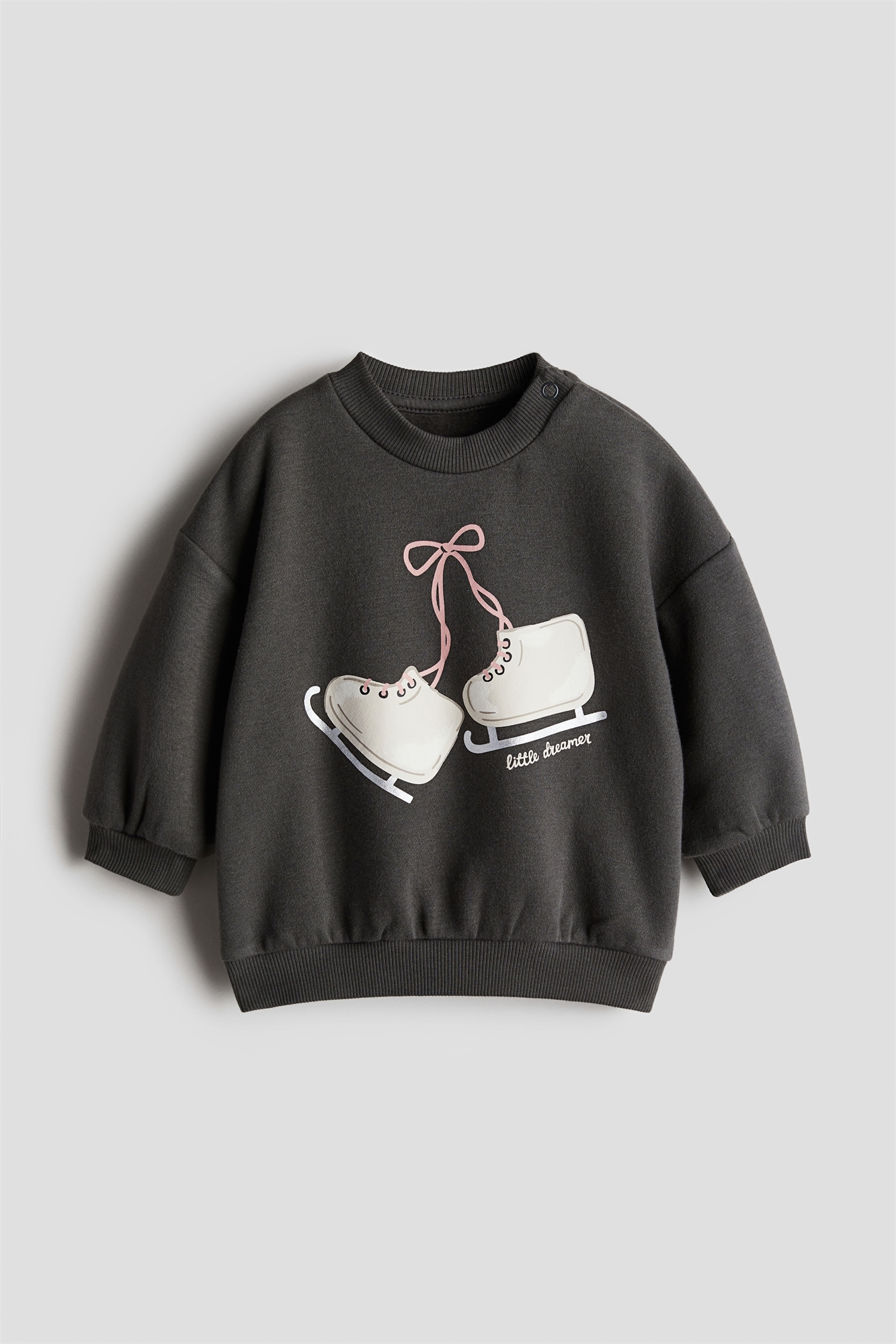 Топ из принтованной толстовки с мягкой ворсистой внутренней стороной. Круглый вырез в рубчик с застежками с одной стороны (кроме размеров 2-4Y), спущенные плечи, манжеты и подол в рубчик.