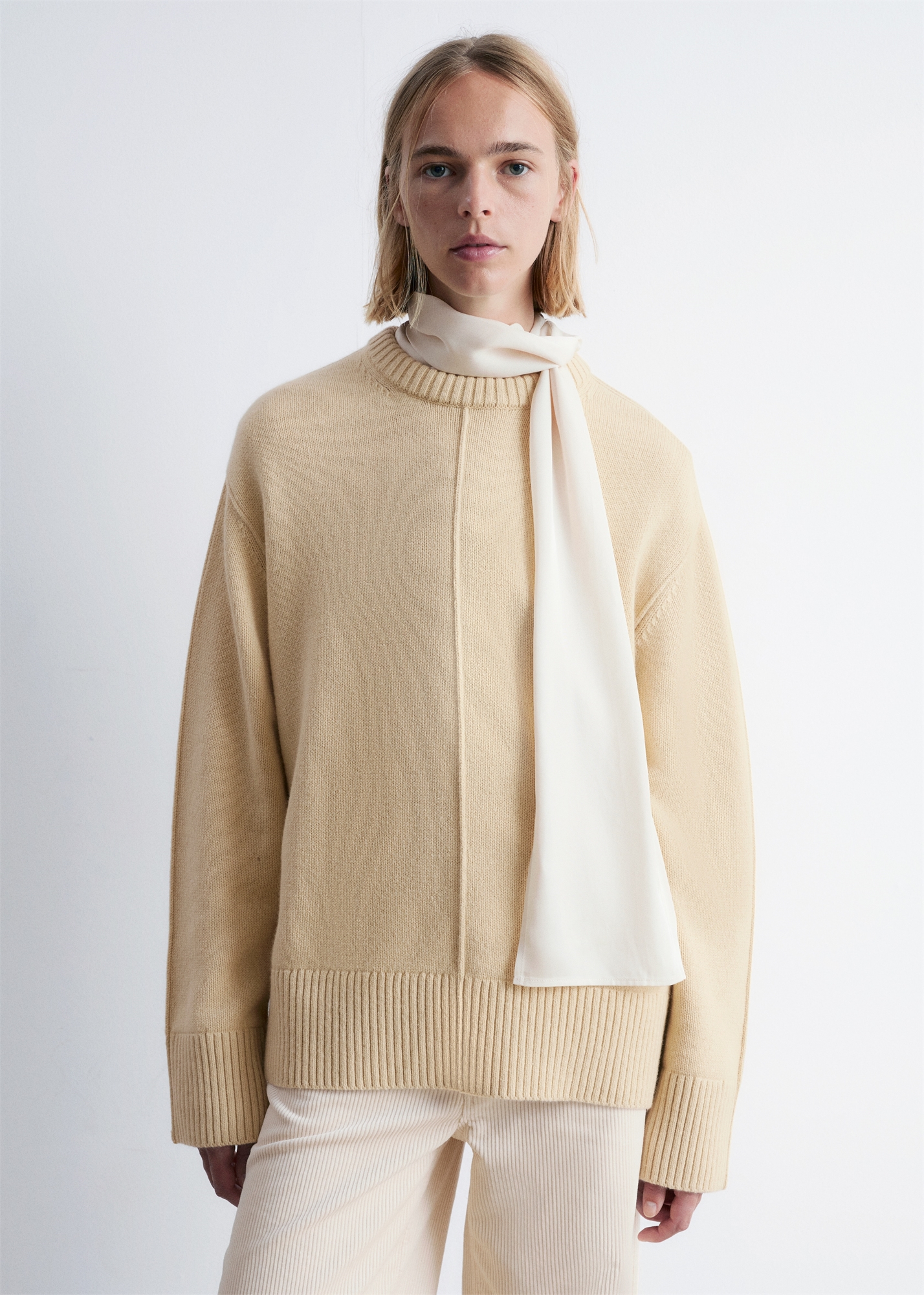 Свитер оверсайз с длинными рукавами, вязаный из шерстяного микса. С декоративным швом спереди и сзади. • Круглый вырез • Ребристая горловина, манжеты и подол • 55% шерсти RWS TE-00047206 Длина свитера: 64 см / 25,1" (размер S)