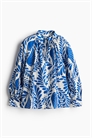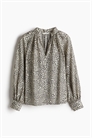 Блузка оверсайз из тканого материала с воротником-стойкой со складками по всему периметру и V-образной проймой спереди. Длинные рукава-баллоны реглан с разрезом и пуговицей на манжетах, подол прямого кроя.